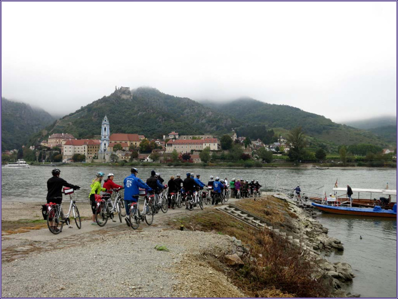 강 건너 Durnstein으로 가려고 배를 기다리고 있는 자전거 여행자들