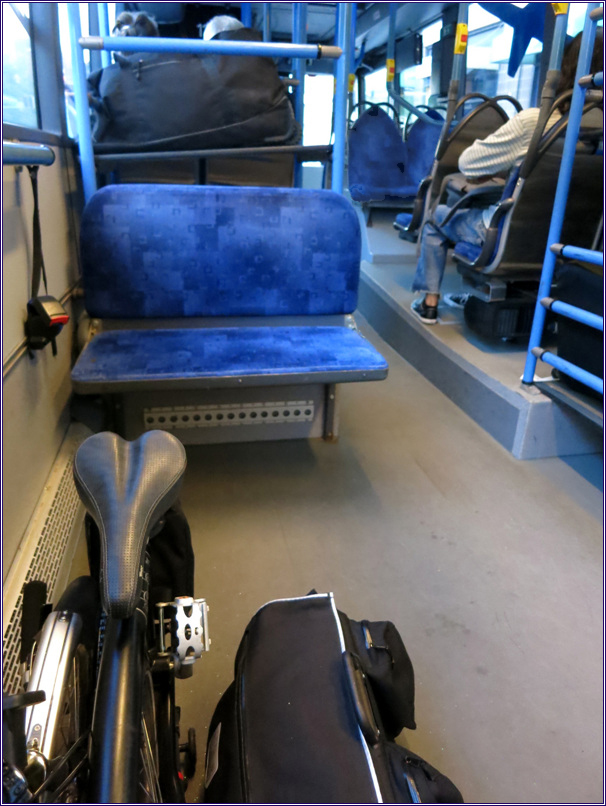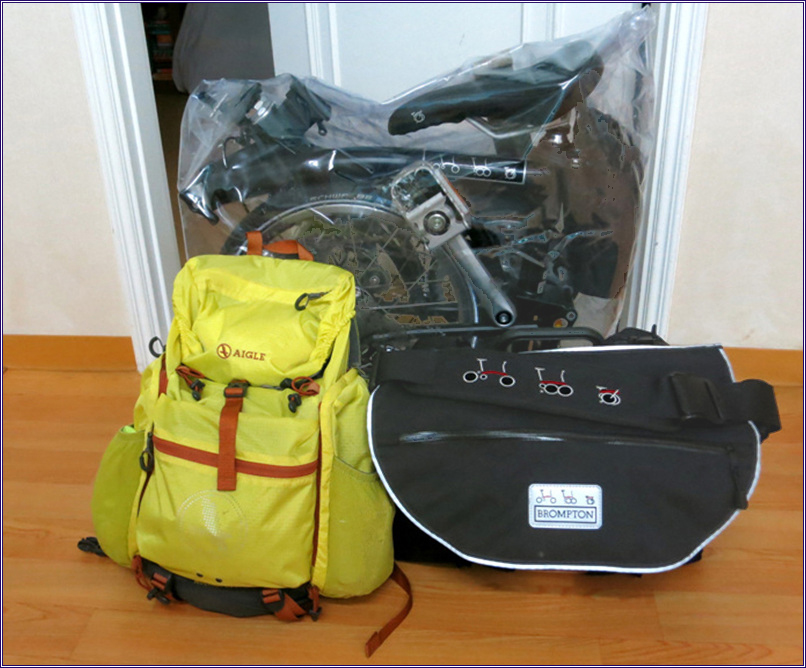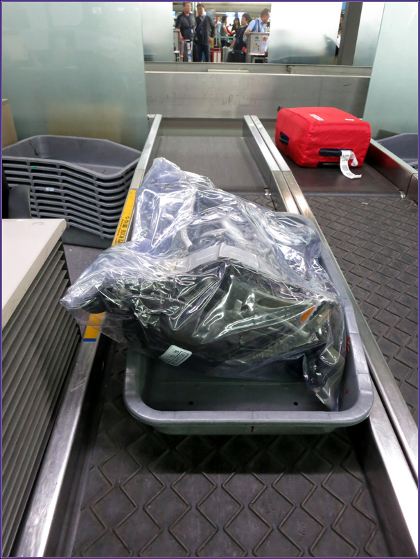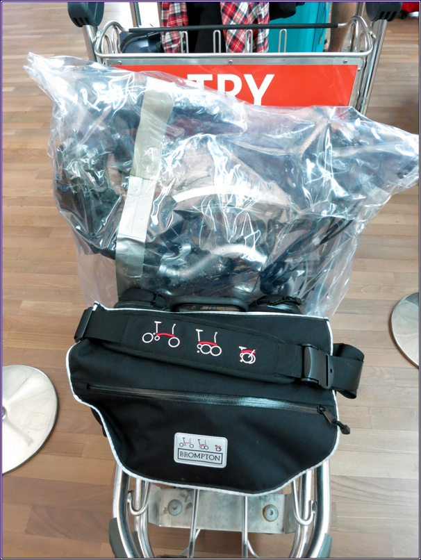 접이식 자전거는 가방에 넣어서 체크인 할 수도 있으나 투명한 플라스틱 천에 싸서 보이도록 하면 짐을 옮기는 직원들이 더 조심한다고 해서 그렇게 했는데 정말 그런지는 모르겠다. 손잡이도 없게 해서 두 손으로 들지 않을 수 없게 만들었다. 플라스틱 천은 도착 직후 버렸다가 귀국 비행기를 타기 직전에 다시 살 것이다