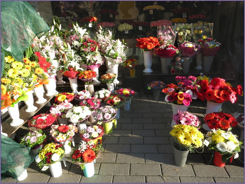 석양을 듬뿍 받고 있는 꽃가게 꽃들