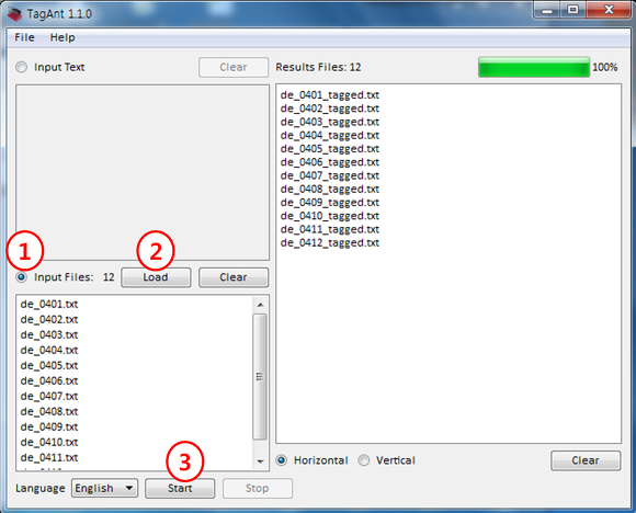 3. Start 버튼 클릭->오른쪽에 태깅 완료된 파일목록 확인