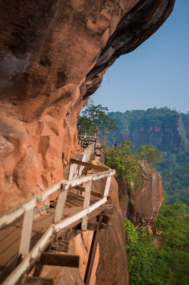 Wooden bridge in red cliffside at Wat Phu Tok mountain in Bueng Kan, Thailand.