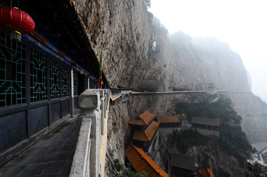 Mianshan scenic area in China consists of a series of temples (mainly Taoist) constructed on these cliffs over time.