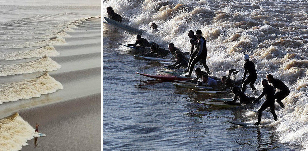 사람들은 이 파도를 타고 강에서 서핑을 즐기기도 합니다.