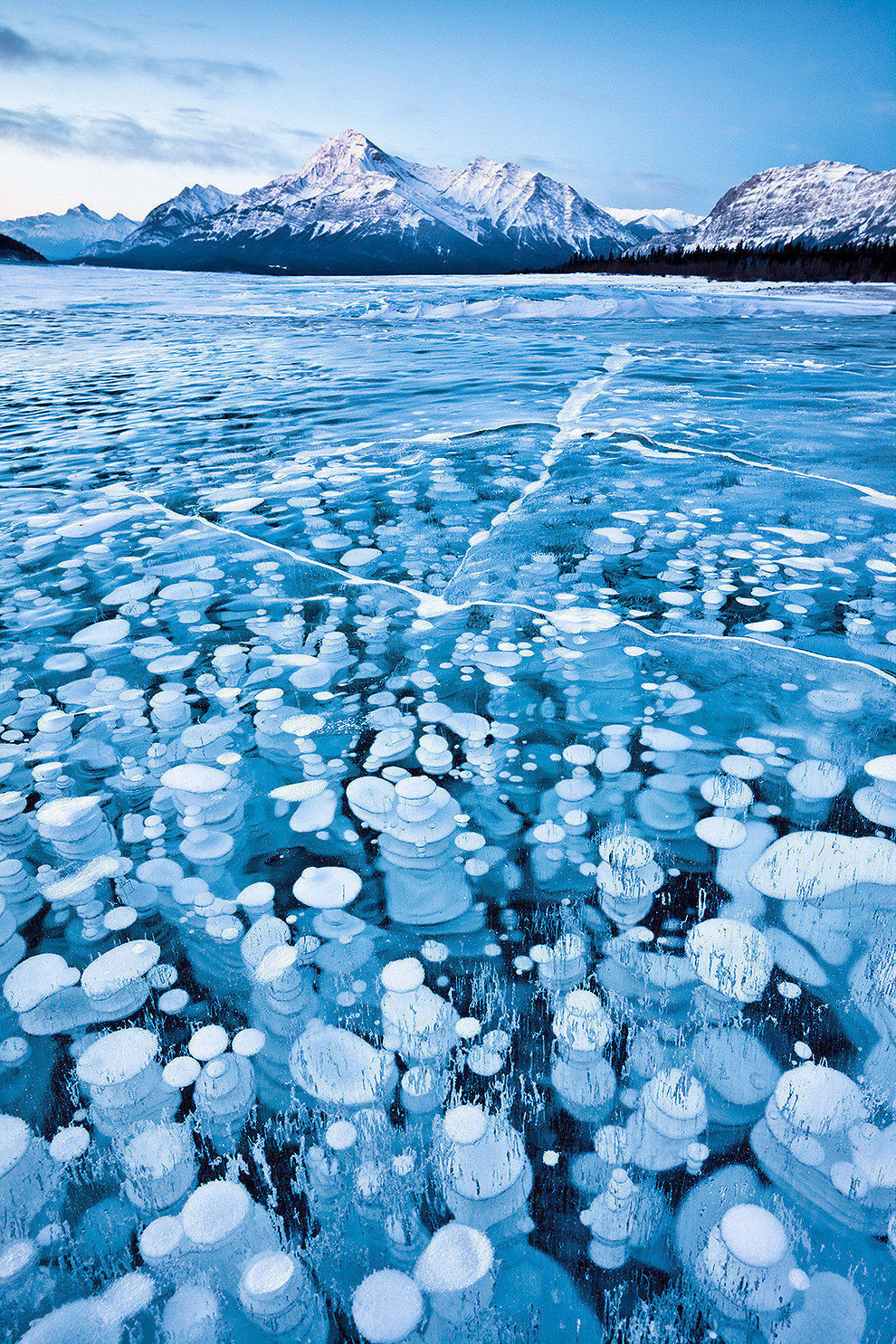 메탄가스 버블이 얼어서 알래스카 호수 밑에 갇혀 있는 모습