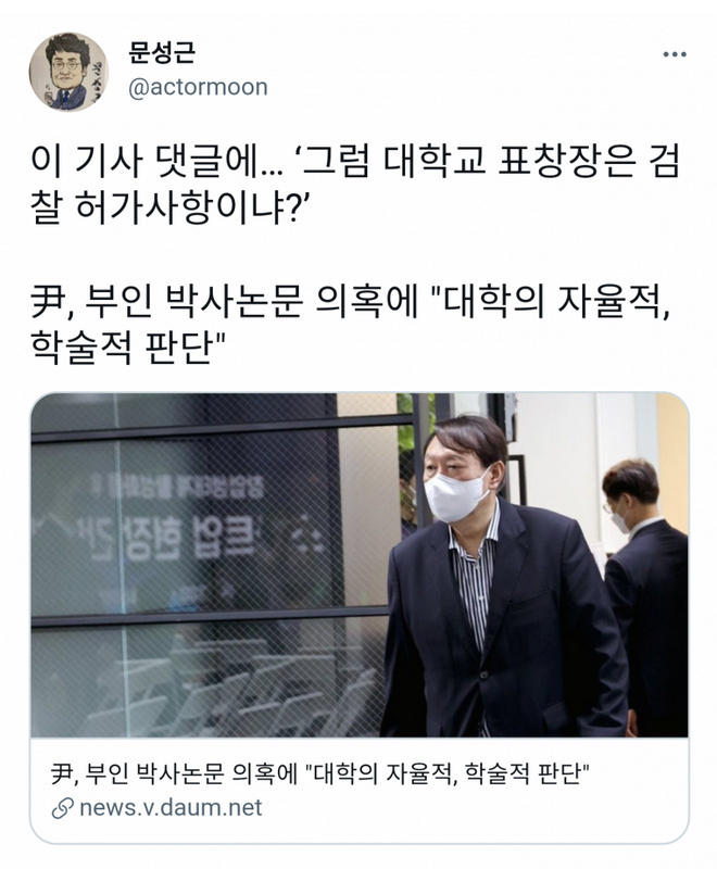 야권 유력 대권주자인 윤석열 전 검찰총장은 8일 아내 김건희씨의 국민대 박사학위 논문 부정 의혹에 대해