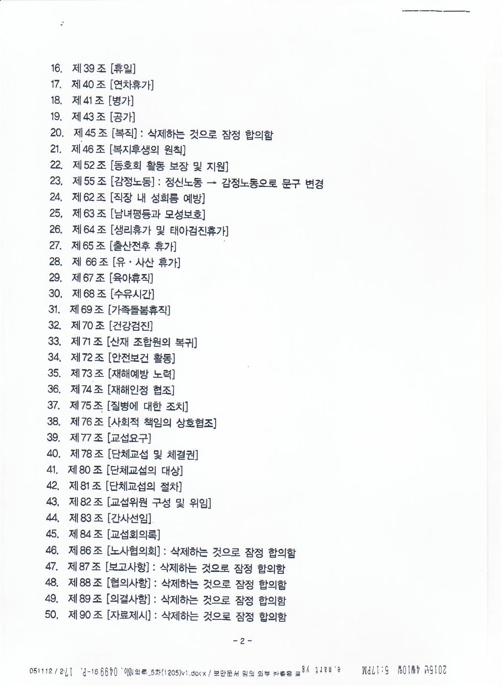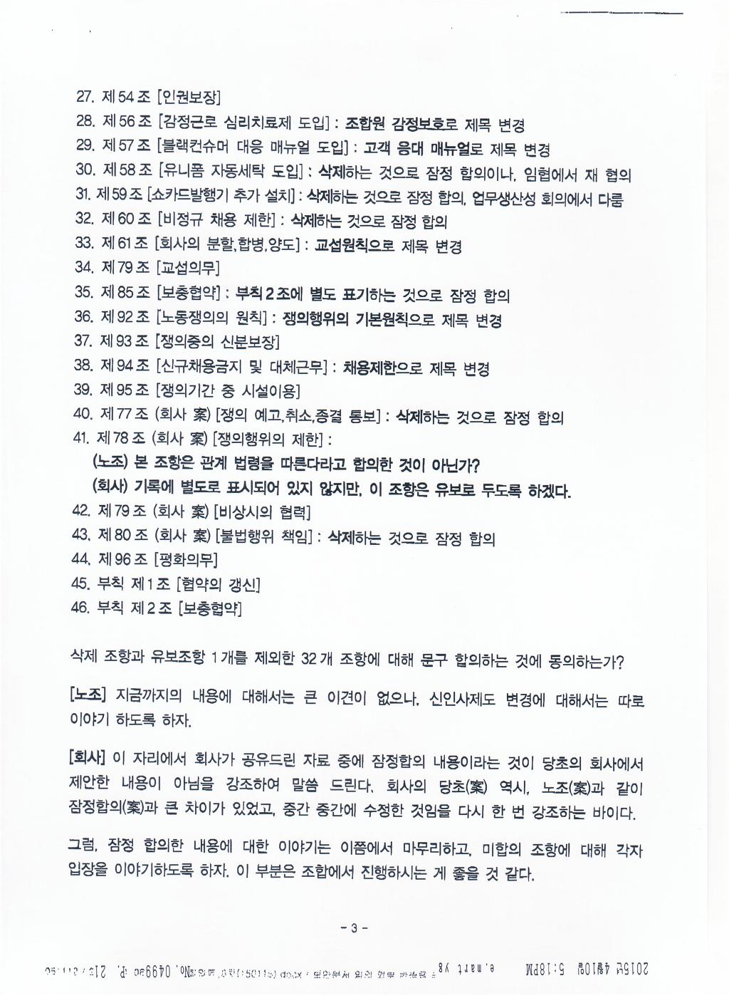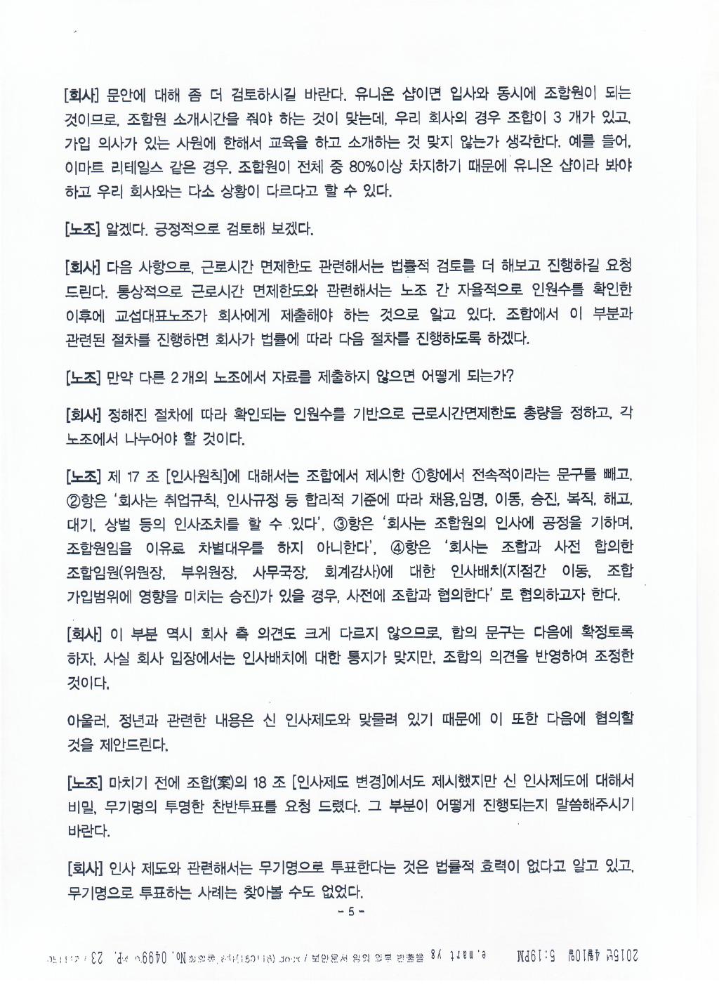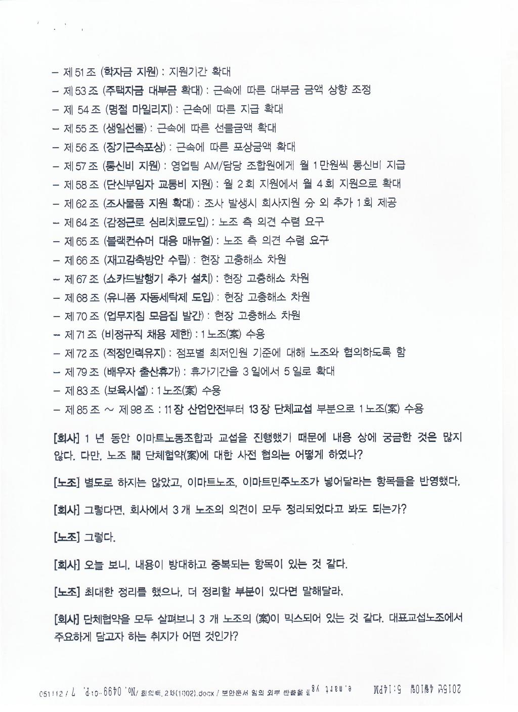 실질적인 내용은 보장받고 문구상 경비원조 등 부당노동행위의 문제가 될 수 있는 부분을 수정하여 합의함. |