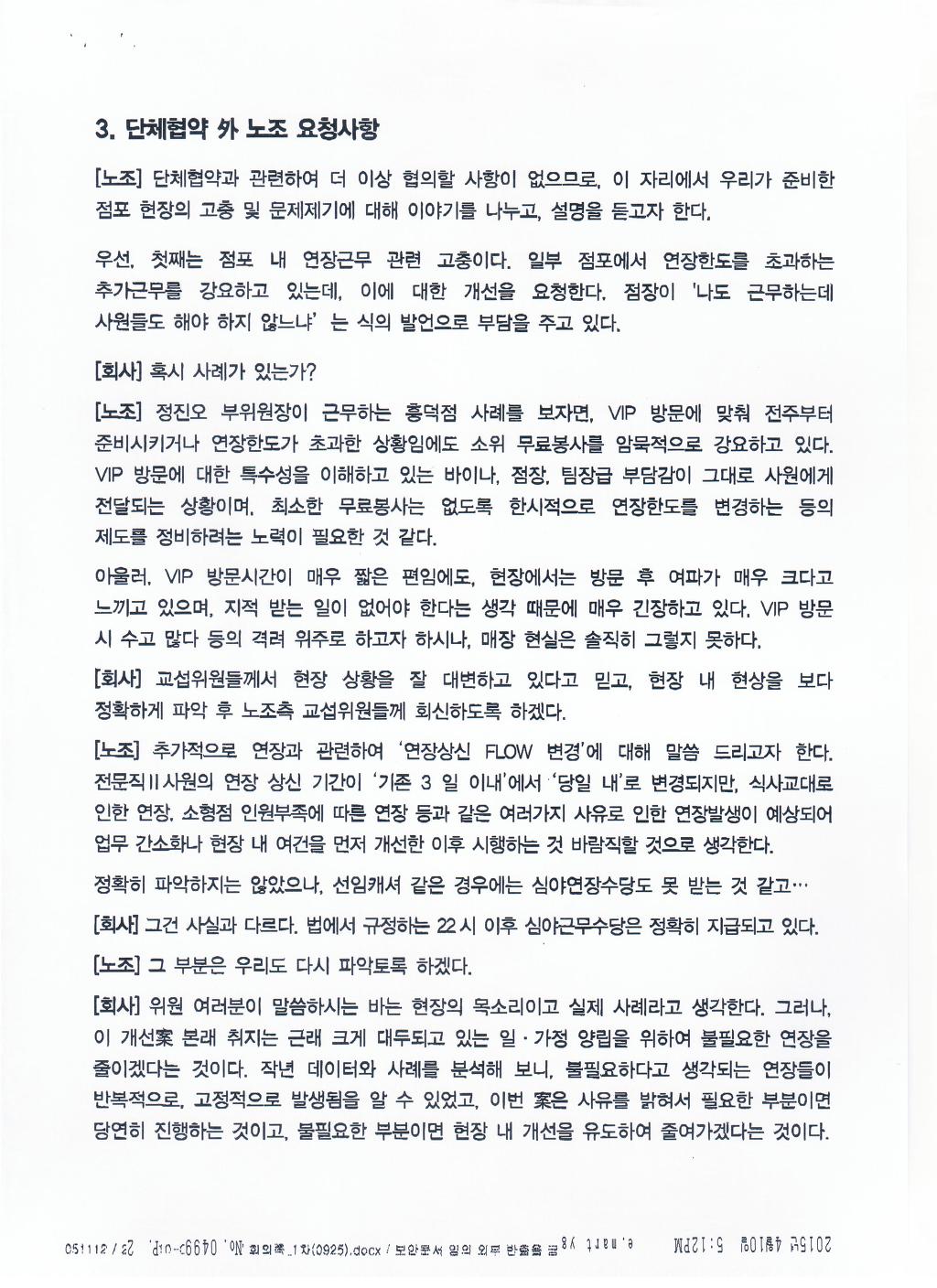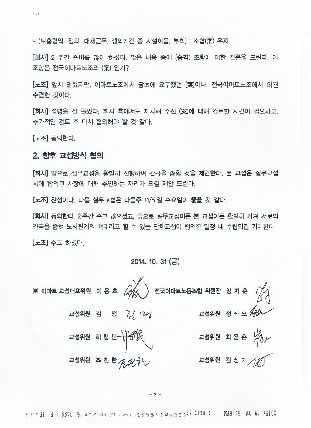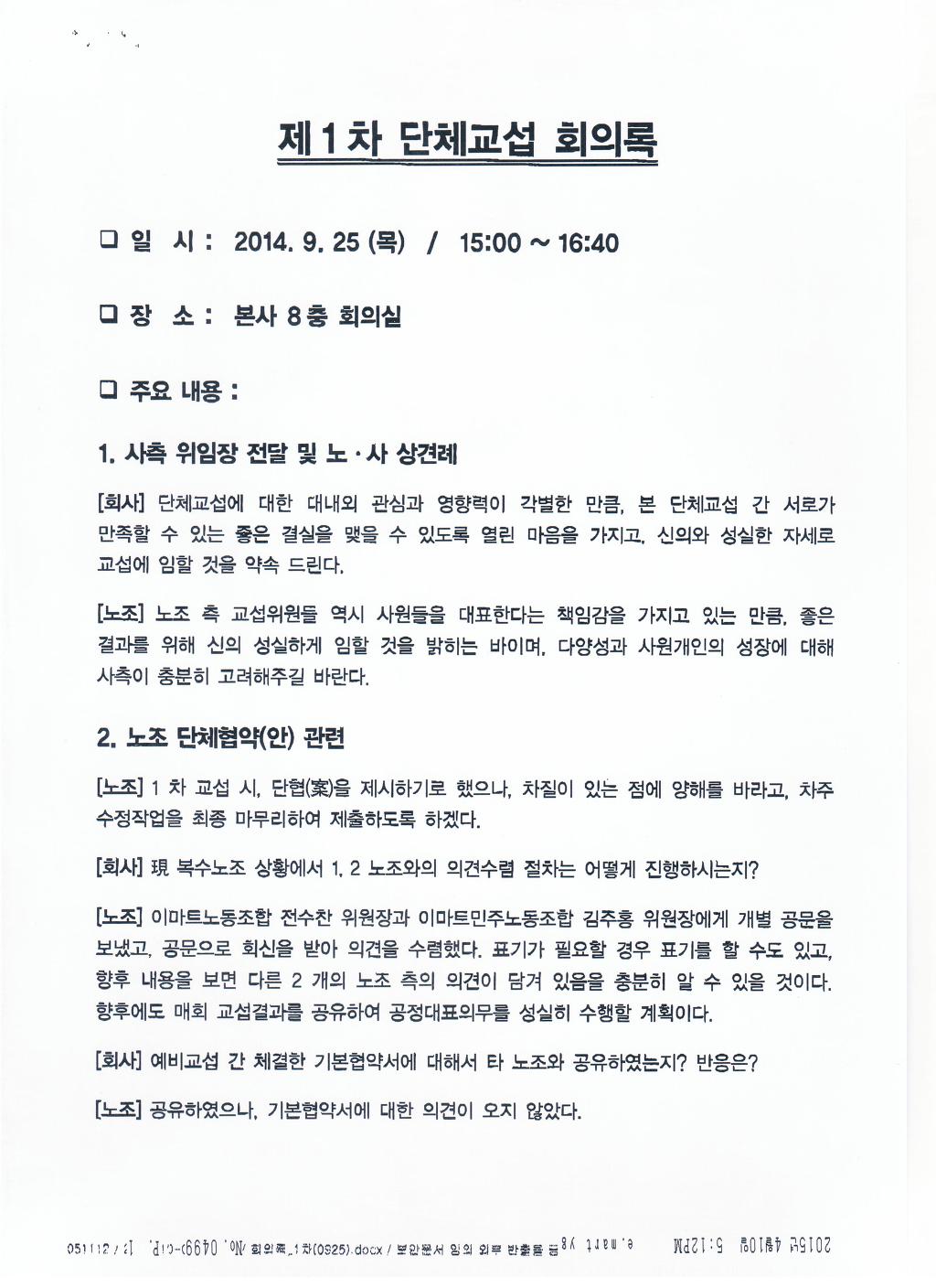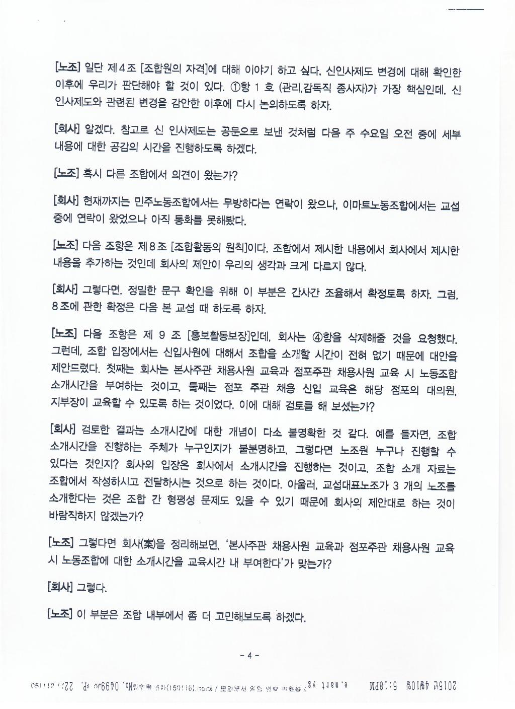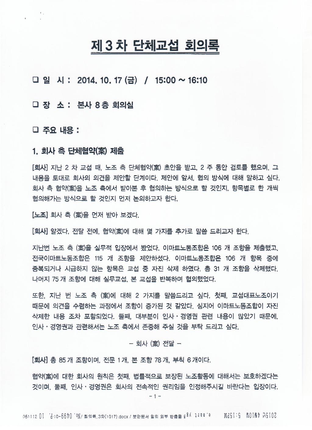 전국이마트노조는 이 조항을 합의한 이유에 대해 실질적인 내용에 차이가 없어 합의하였다고 적시. 자신들의 노조 요구안이 무엇인지도 모르고 교섭하고 있는 것입니다. 사측이 그 동안 공개하지 않고 있는 많은 내용들에 대해 이젠 공개하라고 요구한 것입니다. ‘제공에 협조할 수 있다’는 말 그대로 회사는 협조할 수도 협조하지 않아도 된다는 뜻입니다. 이런 합의조항에 대해 노조가 자료 요구하면 자료를 제출할까요? 이번 신인사제도에 대한 우리노조의 3차례의 자료제출 요구에도 회사는 제출하지 않고 있습니다. 있으나 마나 한 조항을 만들어 놓은 것입니다. | ||