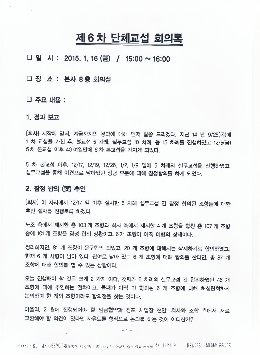 회사의의 분할 합병 양도시 조합원의 고용승계에 관한 원칙을 수립는 내용으로 합의 |