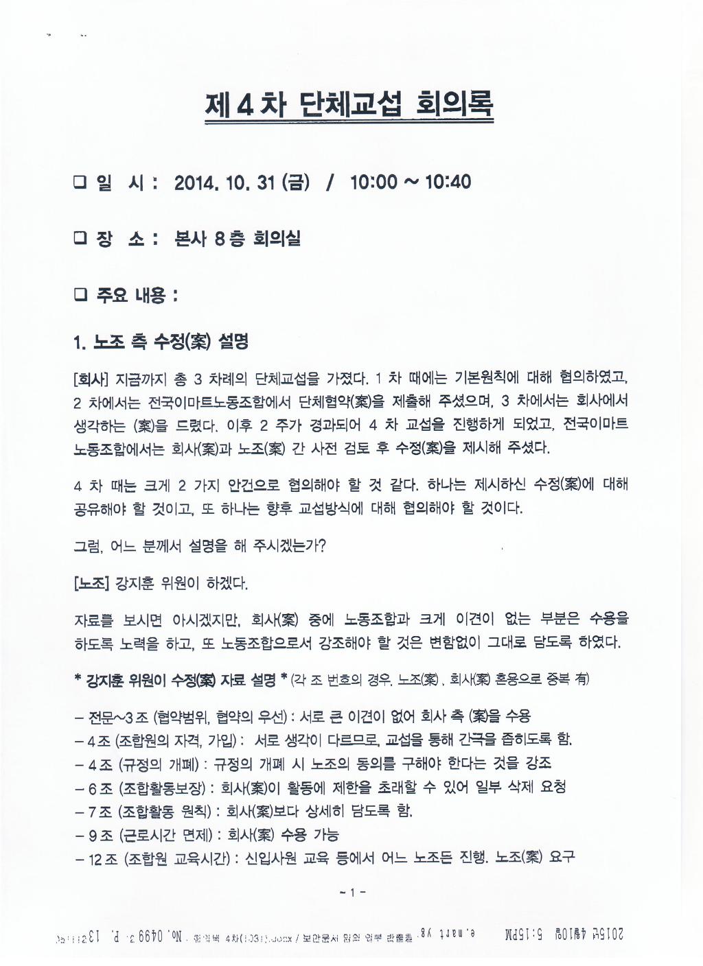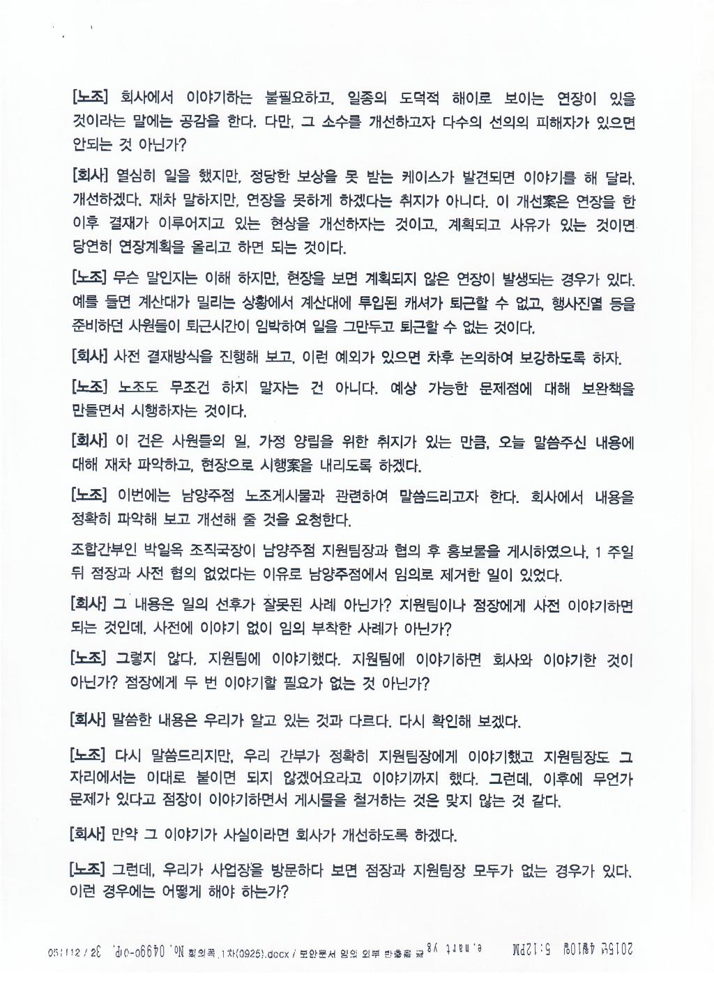 그간 인사결정에 대해 회사 내부적으로 이의제기를 통해 문제해결을 하기 위한 조항을 자신들의 노조가 자신들의 요구안 으로 내놓고 자신들의 요구안이 실효성 없는 이의제기절차라고 이야기하고 있습니다. 도대체 전국이마트노조의 정체는 무엇입니까? 사측과 전국이마트노조가 잠정 합의한 안은 그러한 잠정합의도 없이도 지금도 노동위원회에 구제신청을 통해 할수 있는것입니다. 이러한 복잡하고 사측과 극한대립으로 갈수밖에 없는 법적 절차를 내부적으로 원만히 해결하고자 노조가 ‘이의제기’조항을 회사측에 요구하는 것인데 도대체 전국이마트노조의 교섭위원들은 사측을 대변하고 있는 것이 아니고서는 이러한 잠정합의이유를 밝힐 수 없을 것입니다. | ||