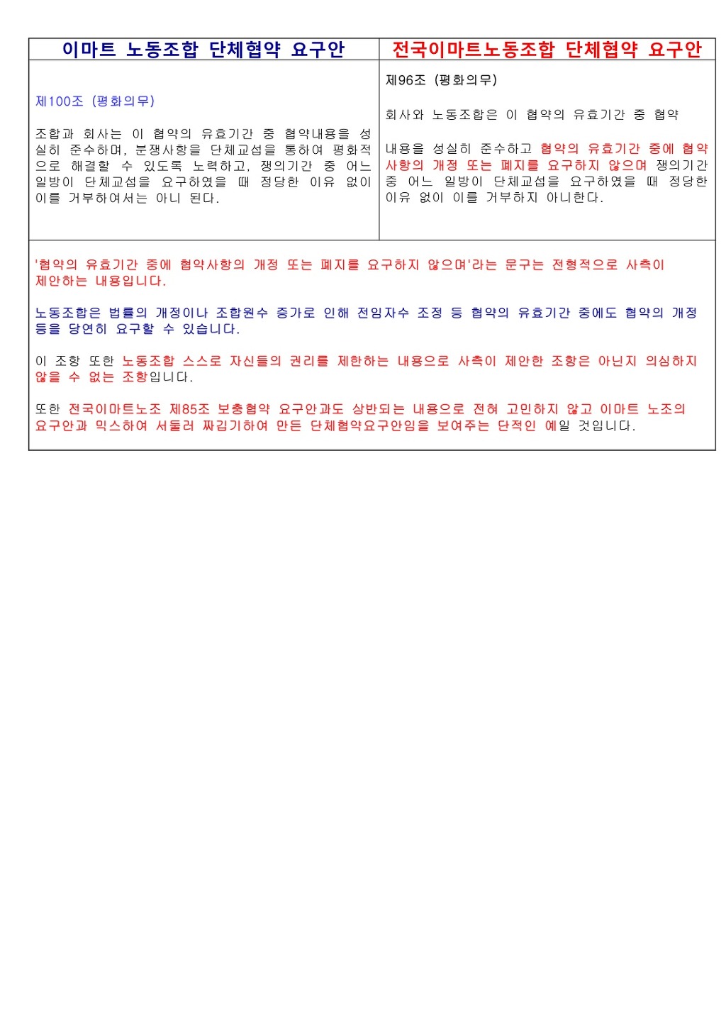 전국이마트노조는 자신들의 처음 노조요구안에 보충협약조항을 두어 유효기간중에도 협약을 개정할 사항에 대해서는 개정할 것을 요구하였습니다. 그러한 노조가 이 조항의 잠정 합의한 이유에 대해 ‘대표교섭노조의 요구안을 회사가 수용’이라고 적시하고 있습니다. 본인들 노조가 무엇을 요구하였는지도 모르고 있는 것입니다. | ||
