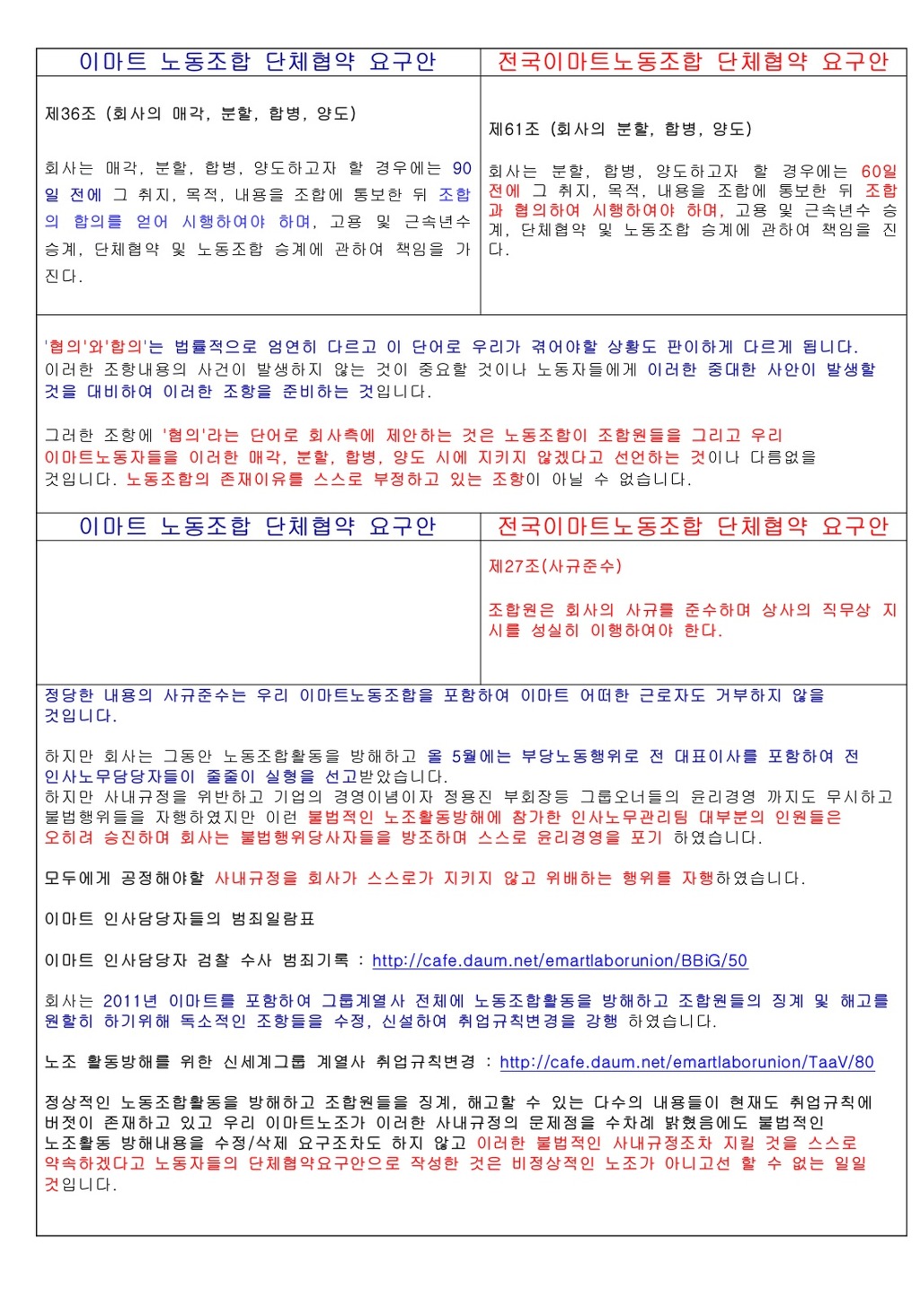 전국이마트노조의 잠정합의이유는 자신들의 노조 요구안과 사측안이 동일한 내용이라 문구를 간소화 하여 합의하였다고 적시되어 있음. 전국이마트노조는 자신들의 최초 요구안에 규정을 개정,개폐할 경우 노조의 의견을 반드시 들어야 하고 근로자의 불이익 변경 시 노조의 동의(합의)를 구해야 한다고 적시하고 있습니다. 회사측과 잠정 합의한 안은 지금까지 회사가 해왔던 데로 회사는 언제든 근로자들에게 불이익한 규정을 개정,개폐할 수 있다고 노조가 합의해준 악질적인 합의안이 아닐 수 없습니다. 최근 사측의 신인사제도 설명회 강행 직전에야 신인사제도가 이마트 전문직사원들의 미래를 막는 악질적인 인사제도변경이라고 주장한 노조에서 이런 중요조항을 이런 어처구니없는 내용으로 합의한 것만 보아도 전국이마트노조가 누구의 입장을 대변하고 있는지 명확히 확인할 수 있을것입니다. | ||