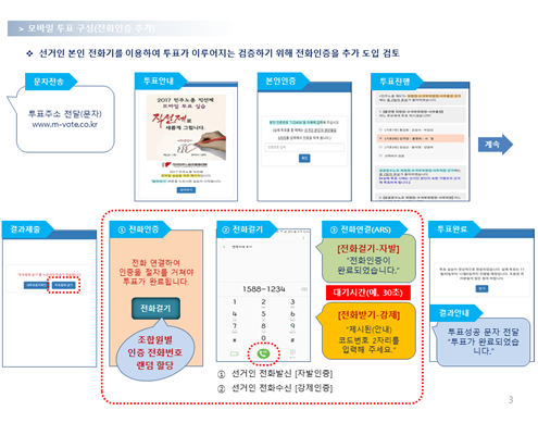 (확인 전화가 자발적 방법으로 투표자가 ‘통화’버튼을 누르지 않는 경우) 투표 시스템에서 자동으로 강제 전화가 투표자 전화가 받게 되며 투표자는 통화 버튼을 눌러 확인해야 완벽하게 투표행위가 종결됨.