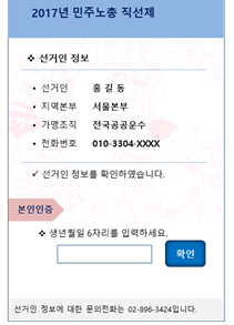 - 투표 진행 ( 총연맹 후보 투표 후 해당지역본부장 선거, 2개 투표 모두 진행 완료되어야 함. 총연맹 후보에게 투표하고 해당지역본부장 선거를 진행하지 않을 경우 총연맹 투표 인정됨. 그리고 추후 다시 해당지역본부장 선거 참여 문자가 발송됨.)