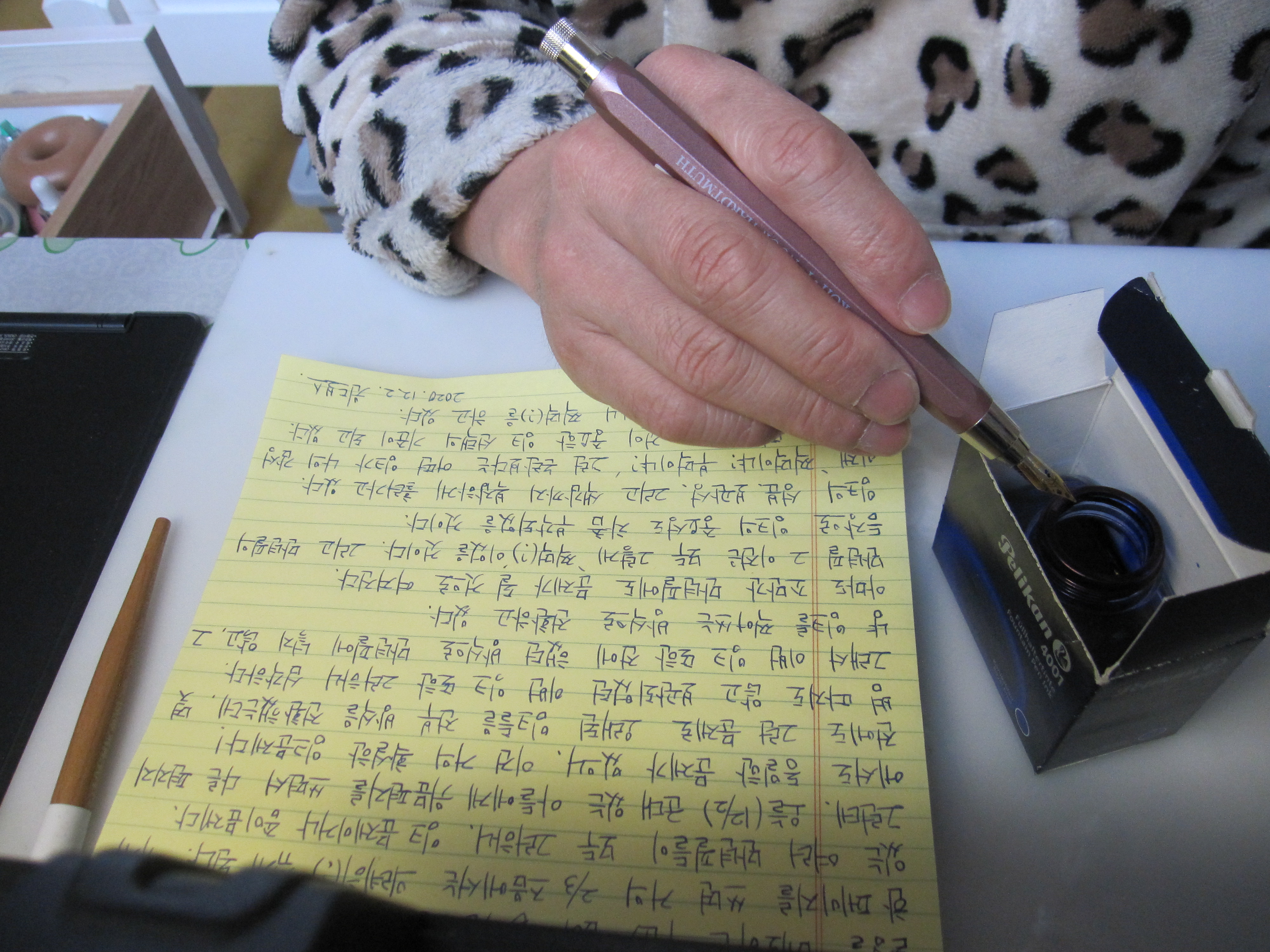 홀더펜으로 물려서 잉크에 찍어쓰고 있다.