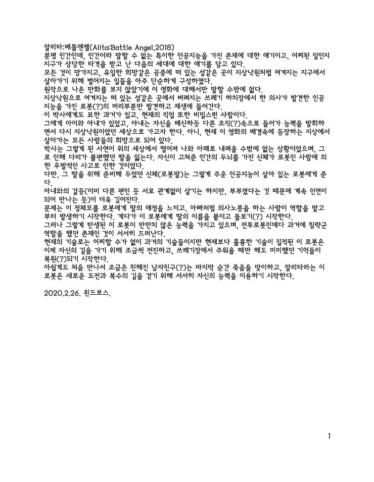 영화감상.알리타 배틀엔젤(Alita Battle Angel,2018) 작성자윈드보스|작성시간20.02.26|조회수67 목록 댓글 0 글자크기 작게가 글자크기 크게가 : 영화감상.알리타 배틀엔젤(Alita Battle Angel,2018): 윈드보스: 2020.2.26. 다음검색 현재 게시글 추가 기능 열기 북마크 공유하기 신고 센터로 신고 댓글 댓글 0 댓글쓰기 답글쓰기 댓글 리스트