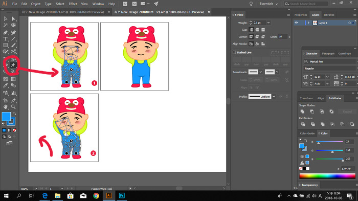 4. 그 후 툴박스에 있는 Puppet Warp Tool로 3개의 축을 만들고 움직이고자 하는 부분으로 회전 시킵니다. (그룹을 만들지 마세요)