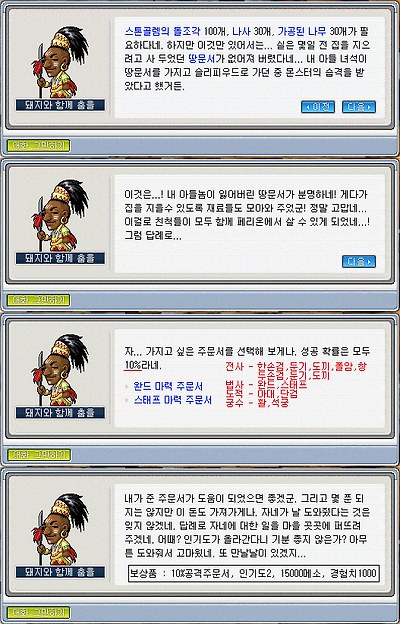 돼지와 함께 춤을의 새집 짓기 제한 레벨 30 이상 인기도 10 이상 '돼지와 함께 춤을'의 집수리 퀘스트 완료 필요아이템 스톤골램돌조각 100개 가공된나무 30개 나사 30개 땅문서(커즈아이) 획득아이템 10% 무기 강화 주문서(선택 가능) 15000메소 인기도 2 등장인물