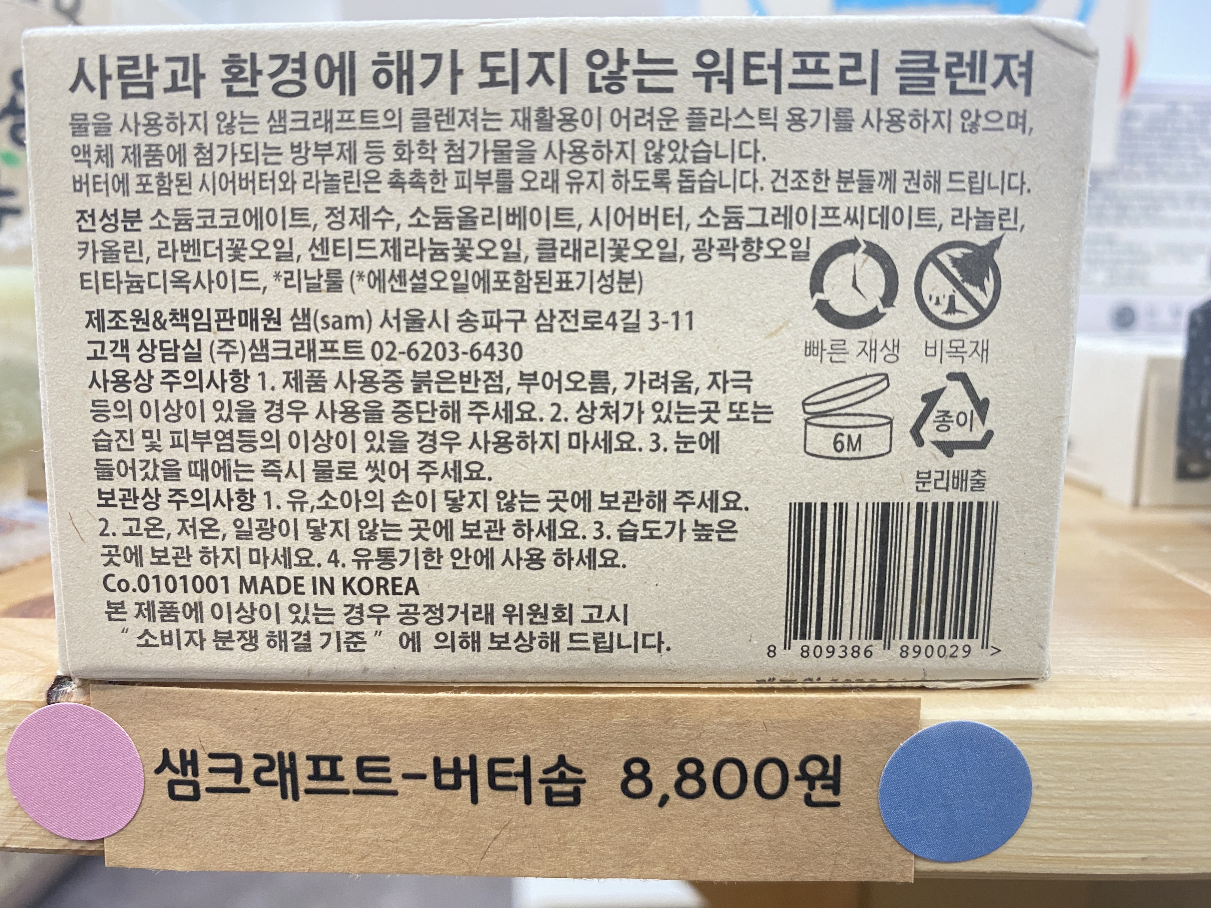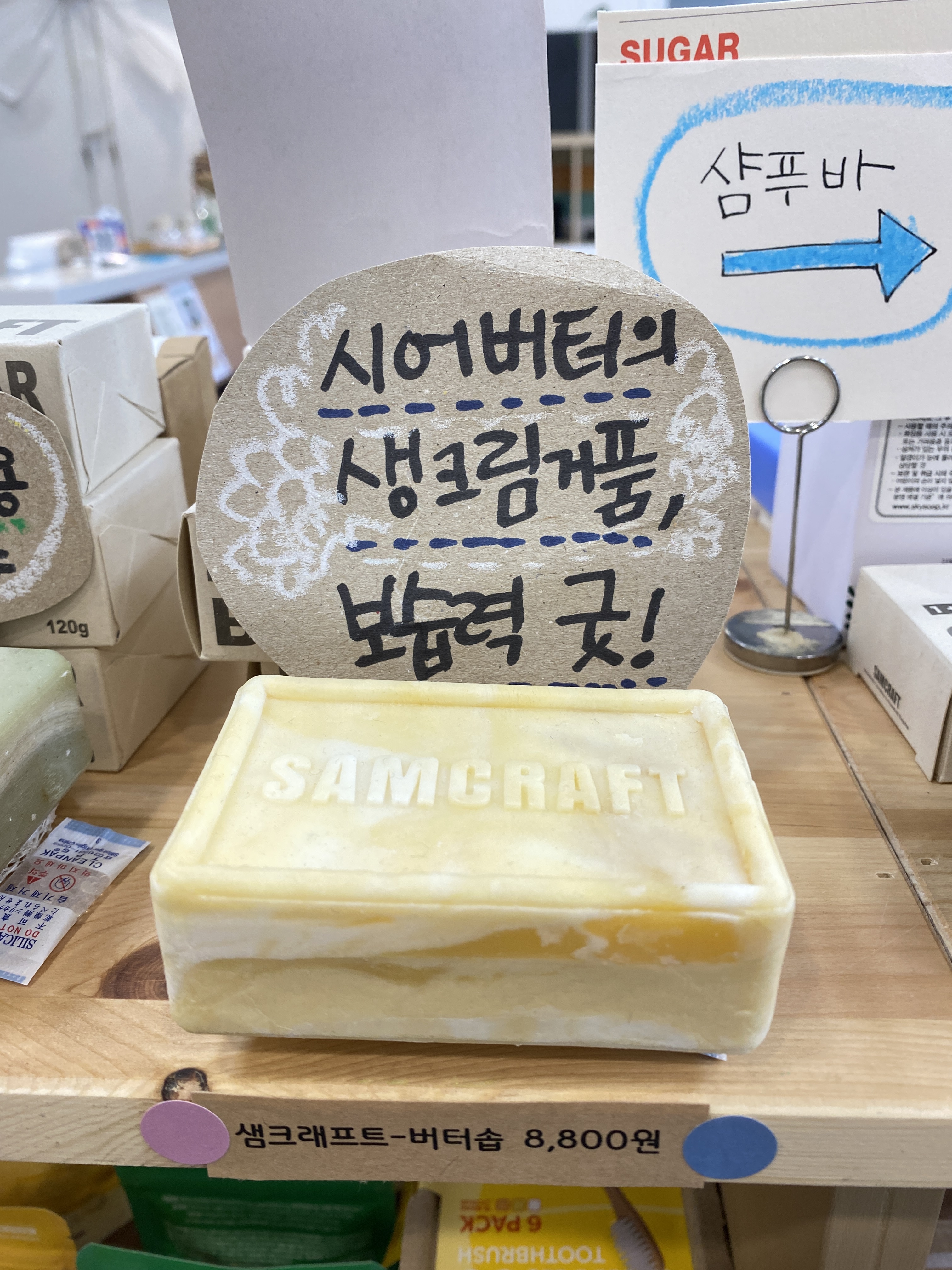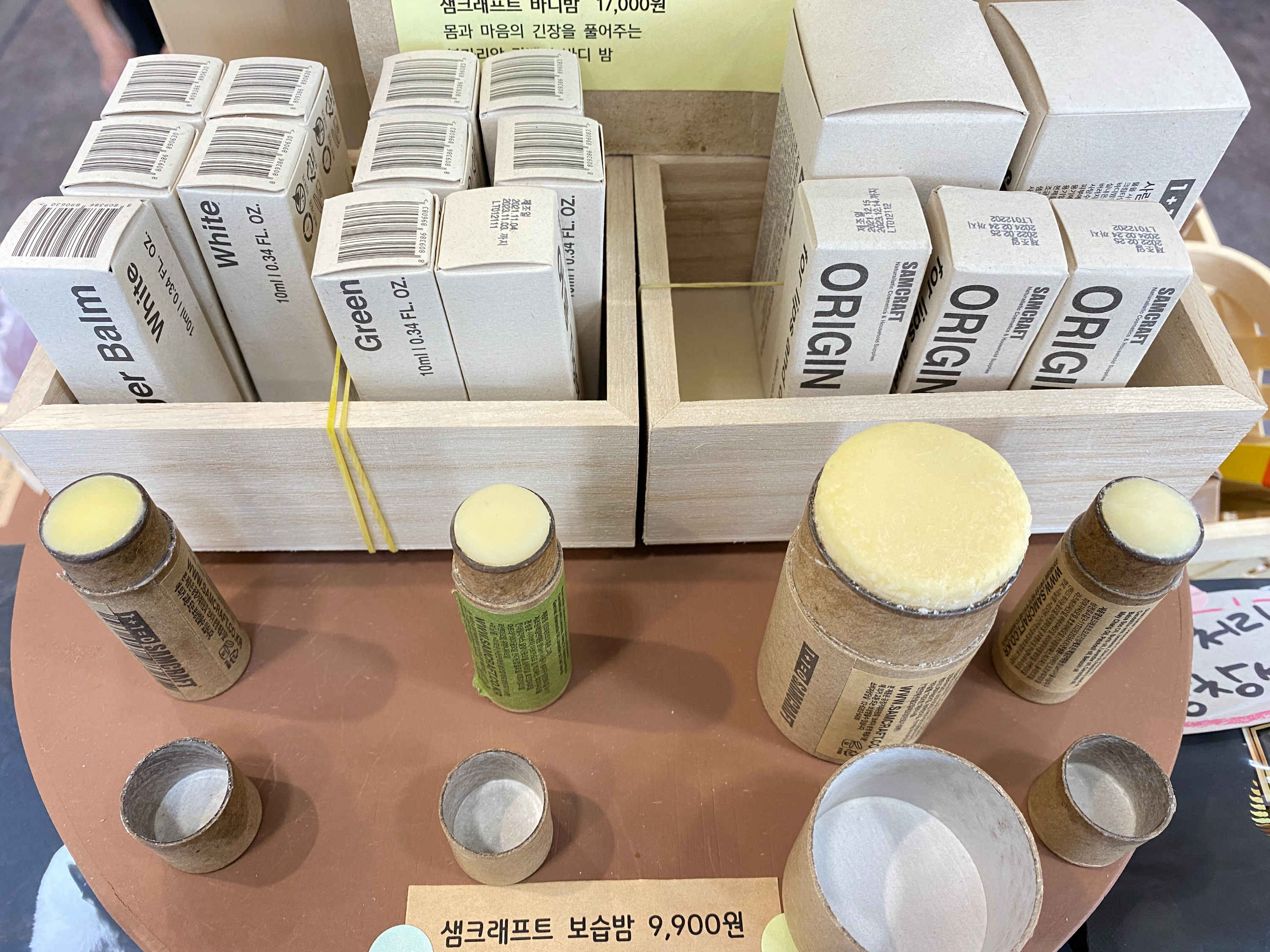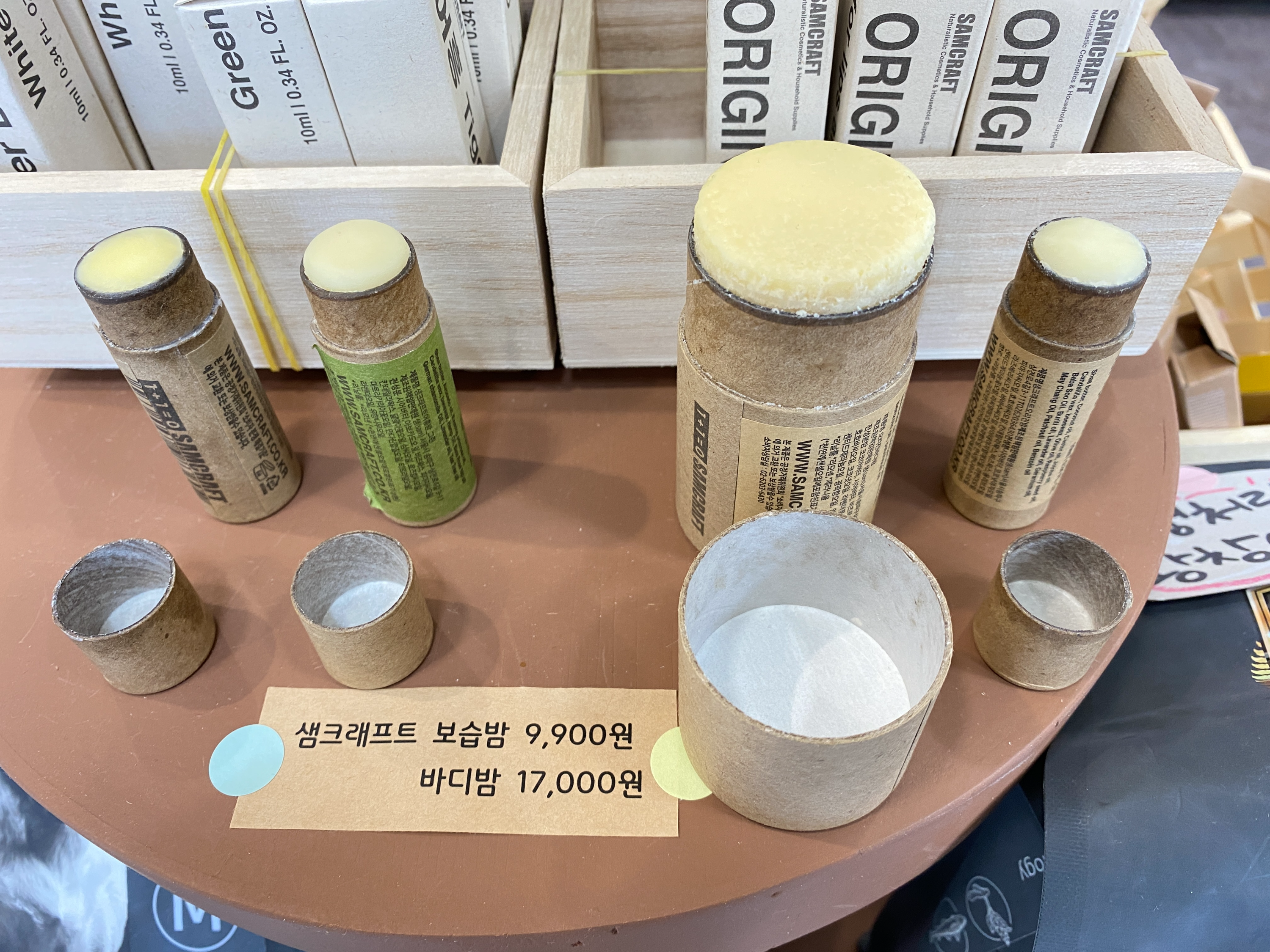 7. 겨울이 다가오면서 보습을 신경써야 하는 시간이 되었죠. 샘크래프트 보습밤입니다. 입술에 바르는 것 외에도 건조한 몸에도 바를 수 있는 바디밤도 준비되어 있어요. 버려지는 플라스틱을 줄이고 싶은 마음을 담아 종이용기에 담아 만들어졌습니다.
