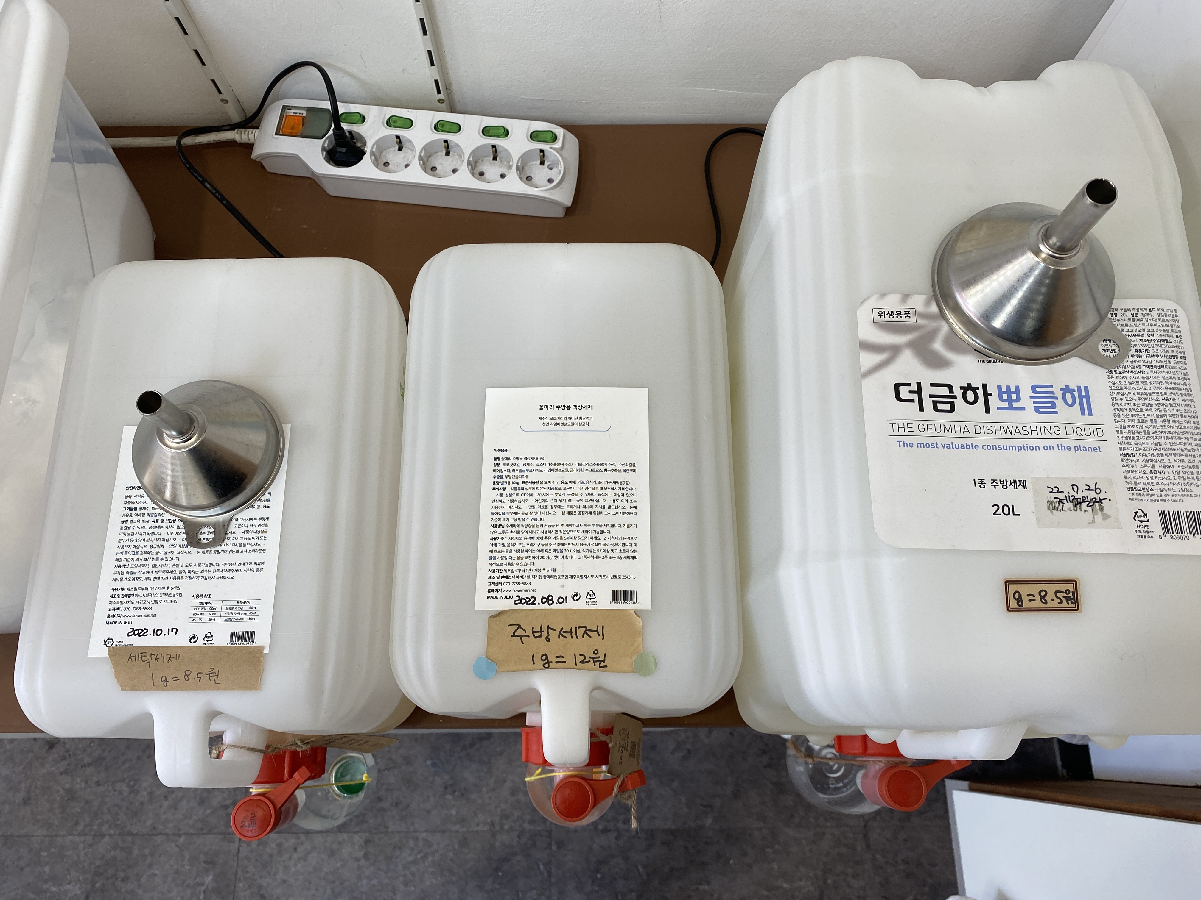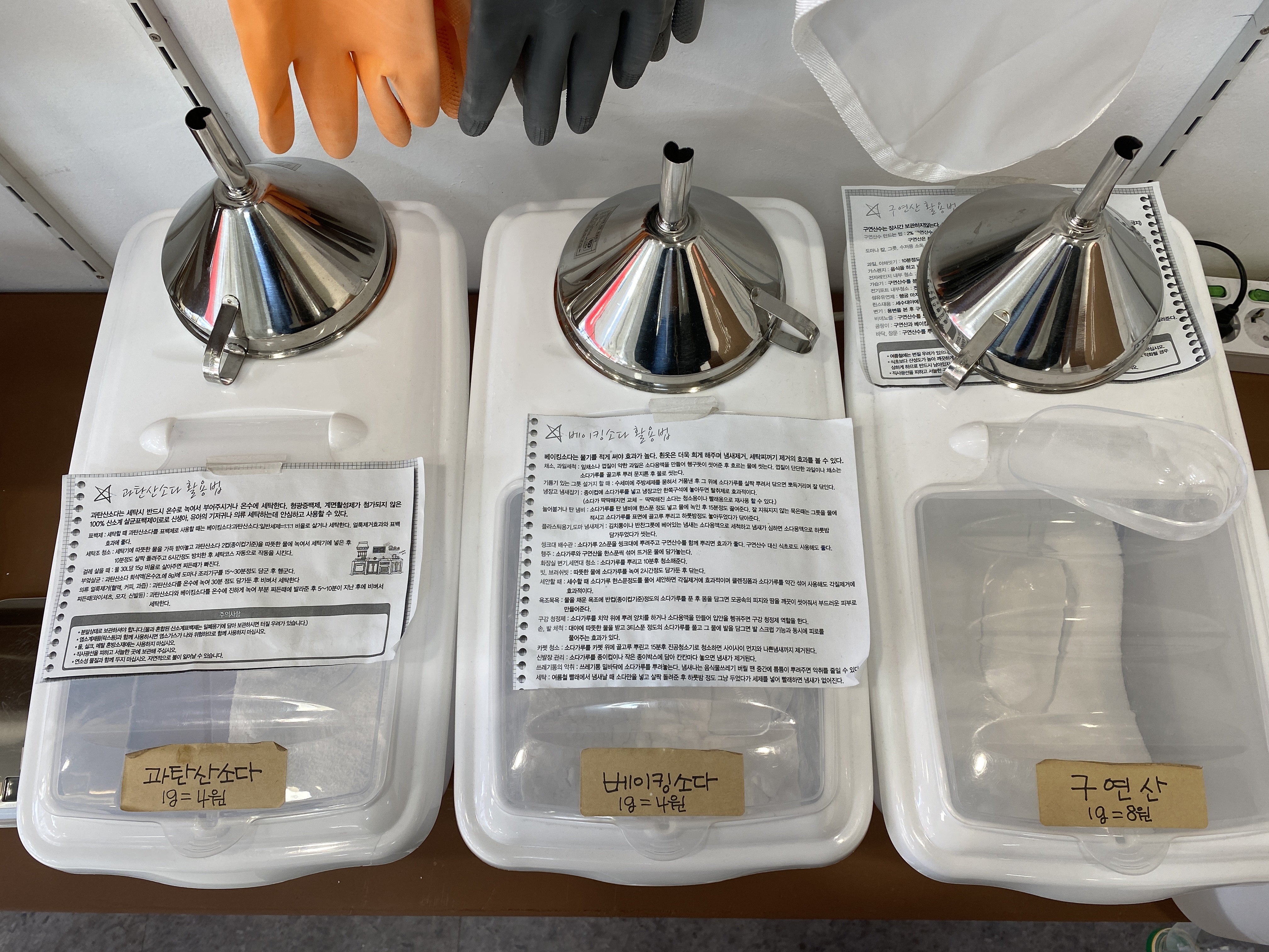 5. 햇빛상점의 자랑! 햇빛상점의 매력! 제로웨이스트의 핵심코너! 리필스테이션이에요. 왼쪽부터 차례로 과탄산소다, 베이킹소다, 구연산, 세탁세제, 주방세제(2종류)입니다. 용기를 가져오셔서 필요한만큼만 담가세요. 리필 3번 이용 시 원하는 리필을 300ml만큼 추가로 더드리는 이벤트를 진행하고 있습니다 :)