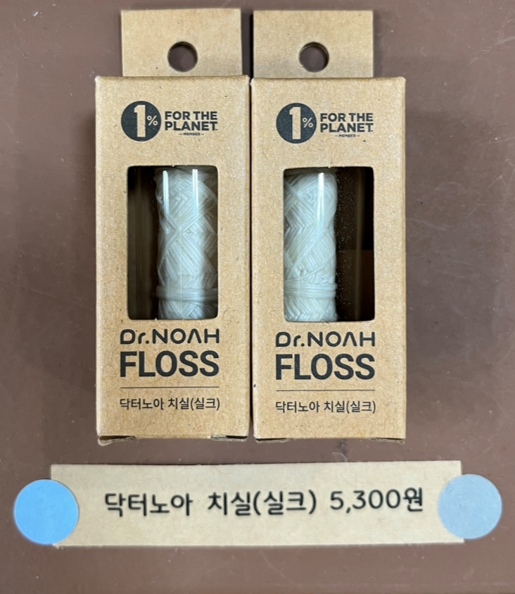 1. 닥터노아 치실(실크) 케이스포함 5300원 : 시중에서 판매되고 있는 대부분의 치실은 플라스틱 실인거 알고 계시나요? 천연 섬유로 미세플라스틱 걱정없는 건강한 치실을 만나보세요. 케이스는 유리병에 알루미늄 뚜껑으로 되어 있어 오래도록 재사용가능해요. 물론 뚜껑에는 실을 끊어낼 수 있는 기능도 있어요.