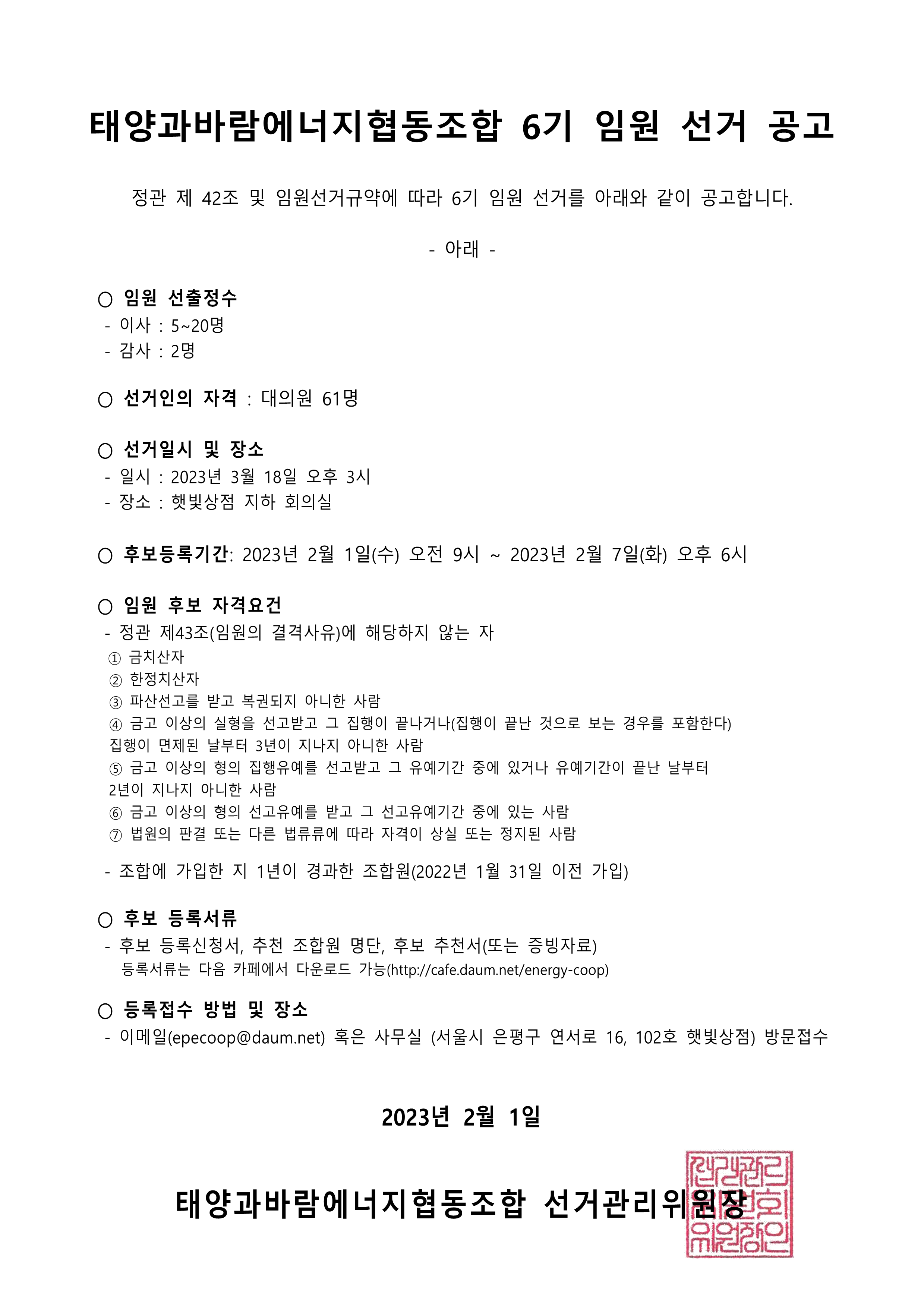 태양과바람에너지협동조합 제6기 임원 선거를 아래와 같이 공고합니다.