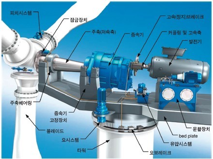 (그림 3-8) 수평축 풍력발전기의 구조 출처: 2012 신재생에너지 백서, ‘풍력’