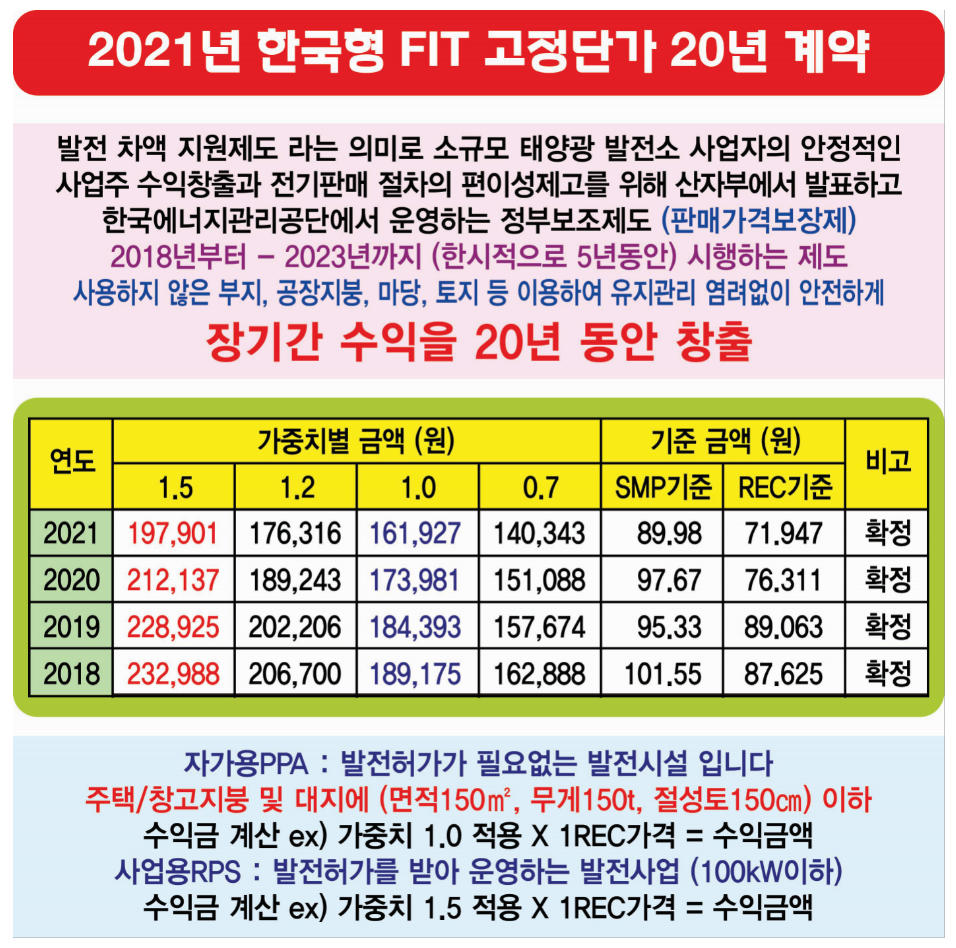 2021년 FIT 적용 계약단가는 kW당 161.927원이며, SMP:89,980원, REC:71,947원 입니다.