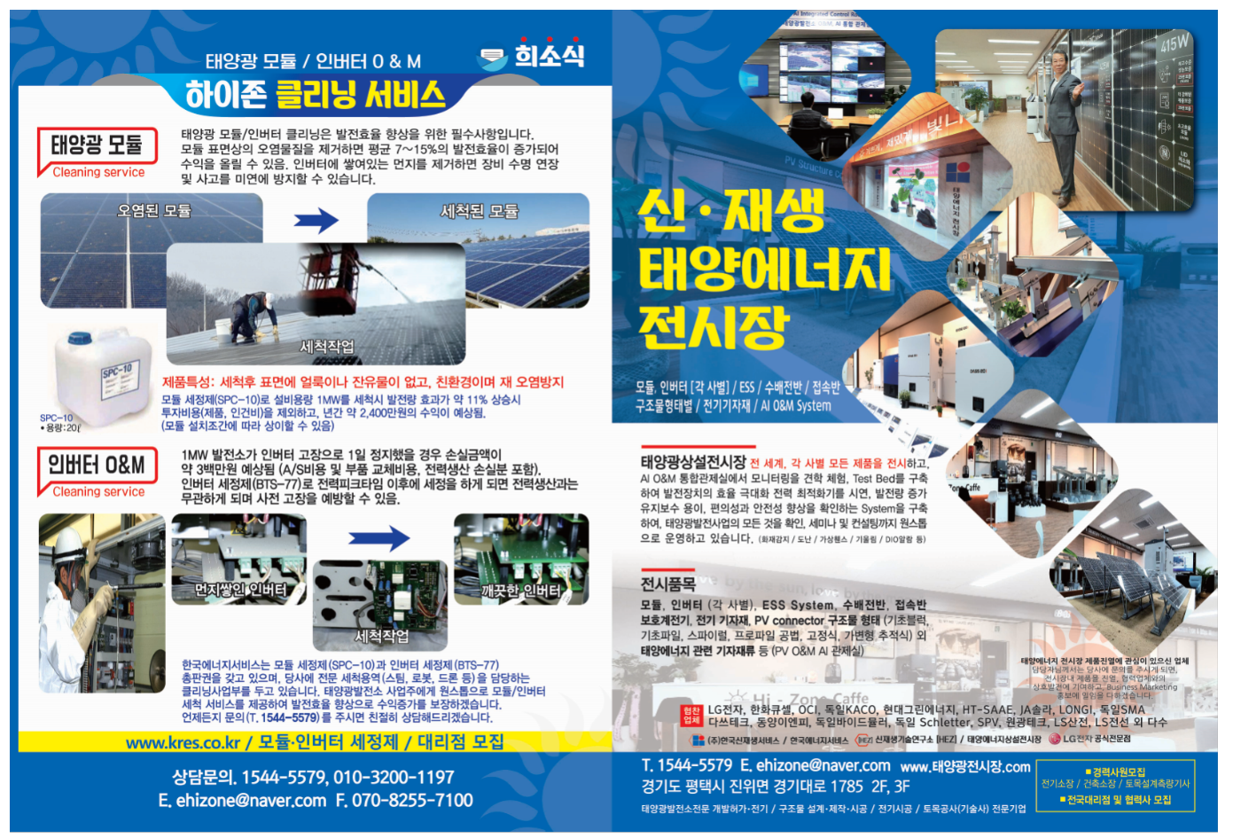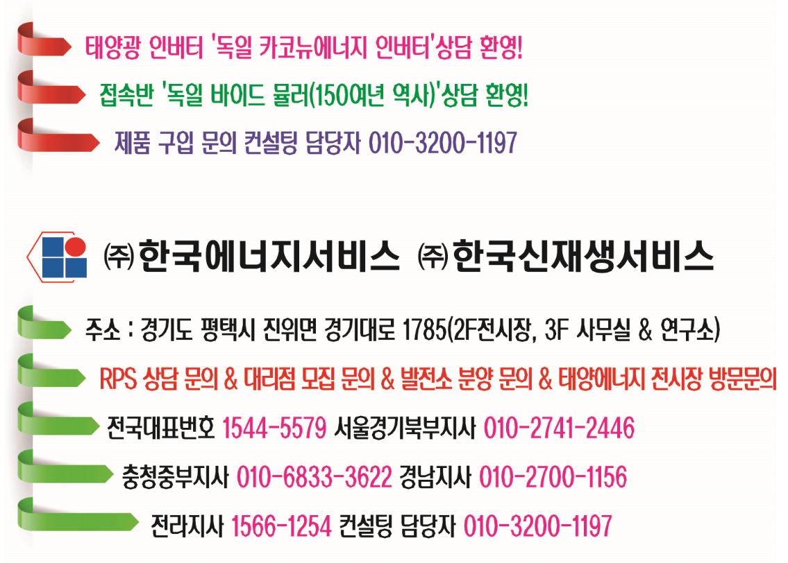 또한 업계 유일 태양에너지 전시장(경기도 평택시 진위면 경기대로 1785 2층전시장, 3층 사무실)을 정식 개관하여 태양광 모듈, 인버터, 접속반, 구조물 기타 태양광발전소 시공과 관련된 일체의 기자재들을 저렴한 가격에 상설 판매하고 있습니다. 전시장 방문을 희망하시는 분들께서는 주저하지 마시고 방문하여 주시면 궁금하신 사항 친절히 답변드리고 전시장안내를 도와 드리겠습니다.