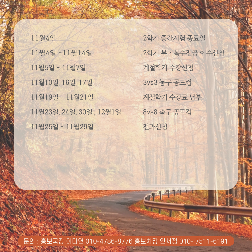 중간고사가 막바지에 이르고있습니다. 이제는 휴식을 즐기며 행복한 순간들을 만들어가시길 바랍니다😊