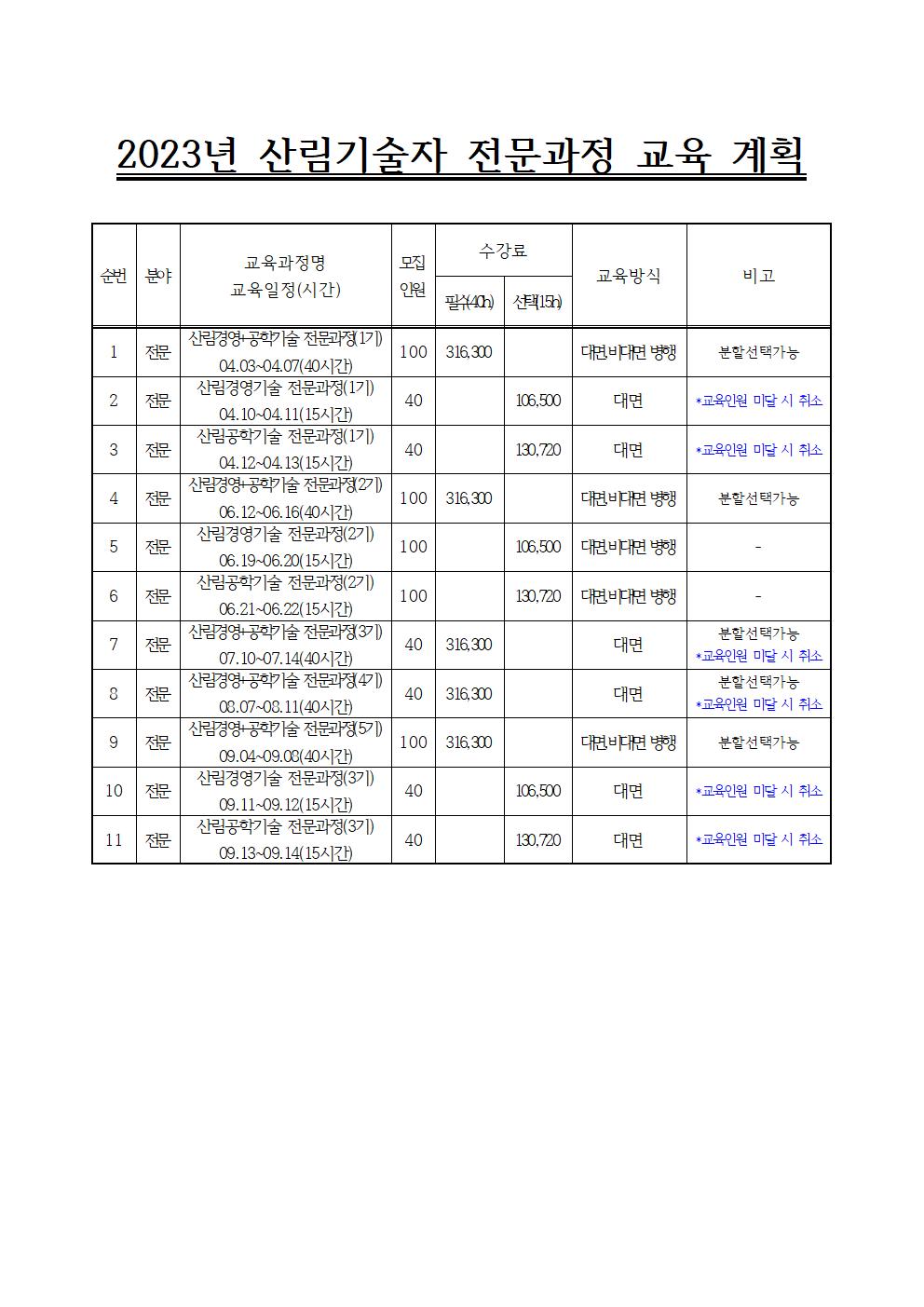 "2023년 산림기술자 전문과정 교육"을 아래와 같이 계획하오니