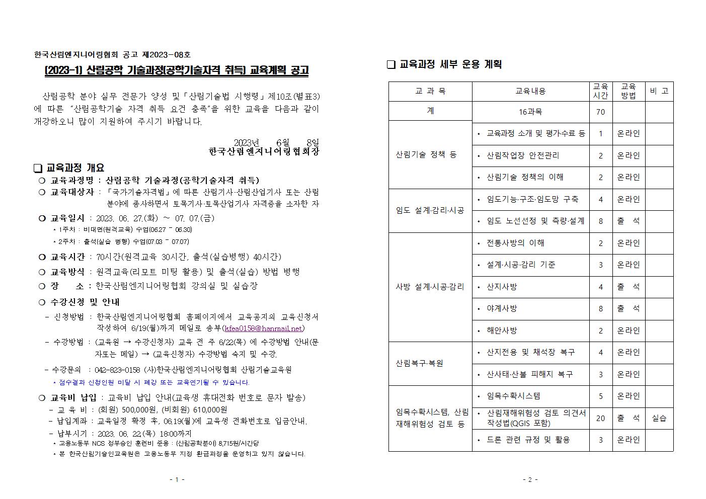 "2023-1 산림공학 기술과정[공학기술자자격 취득과정]"교육을 아래와 같이 계획하오니 많은 지원바랍니다.
