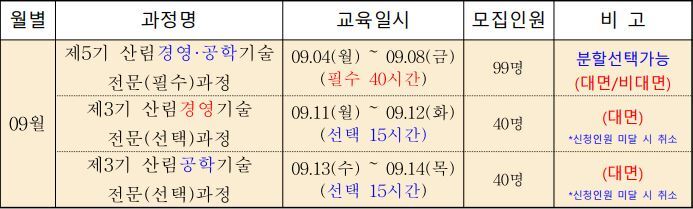 "2023년도 09월 산림기술자 전문과정 교육"을 아래와 같이 계획하오니 많은 지원바랍니다.