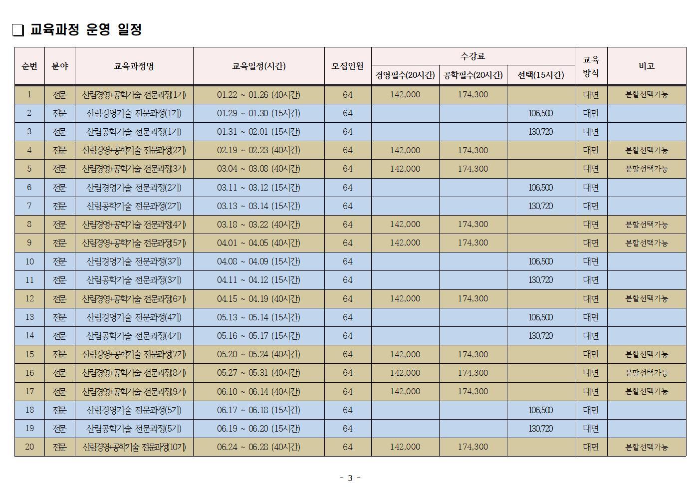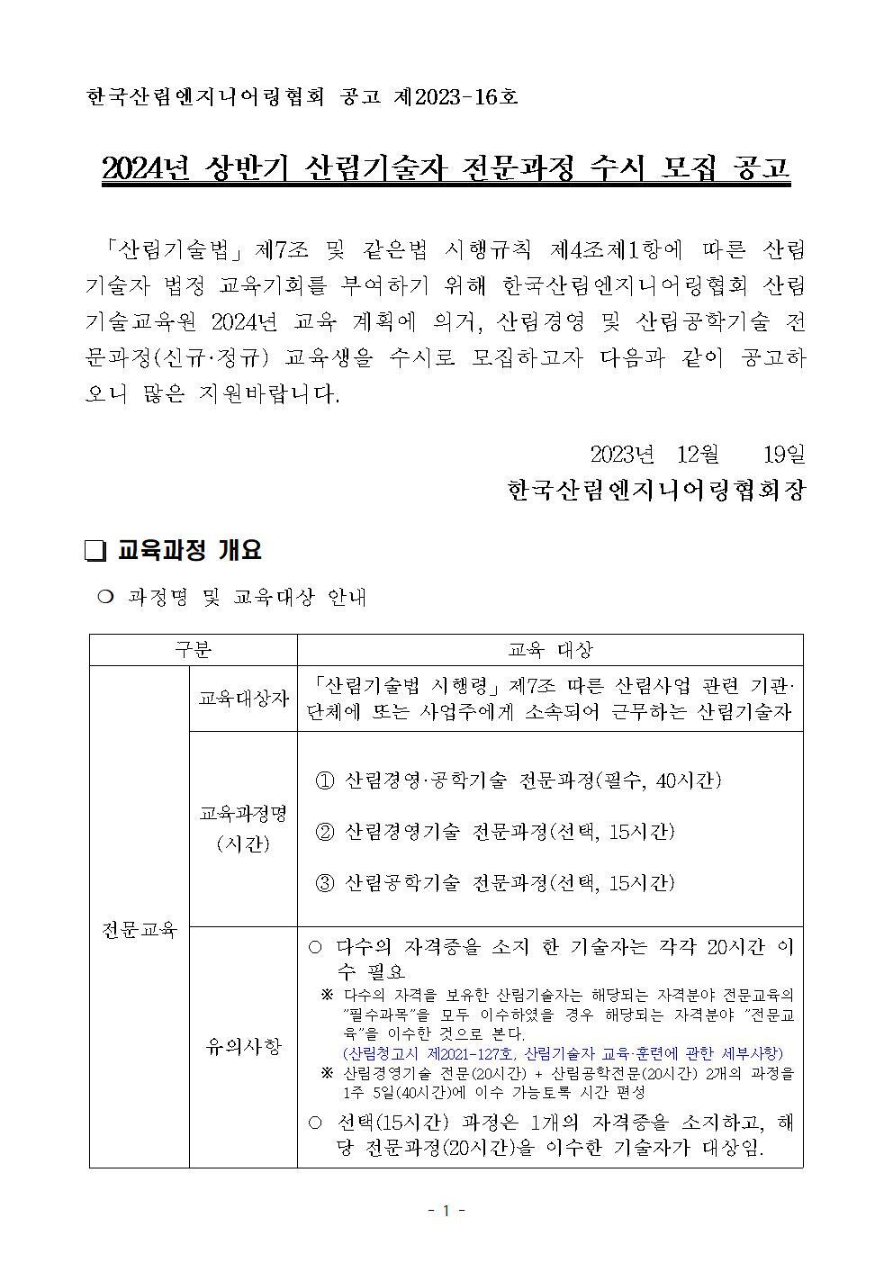 "2024년 상반기 산림기술자 전문과정 교육"을 아래와 같이 계획하여 교육생을 수시로 모집하고자 하오니 일정에 참고하시어 많은 지원바랍니다.