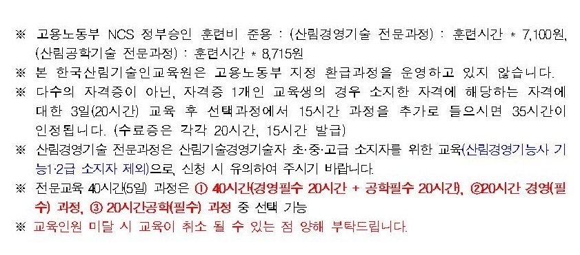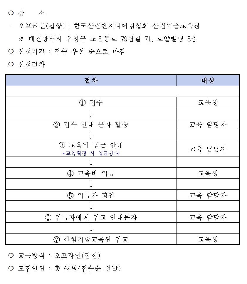 - 수 강 방 법 : 대전광역시 유성구 노은동로 79번길 71, 로얄빌딩3층 산림기술교육원으로 입교