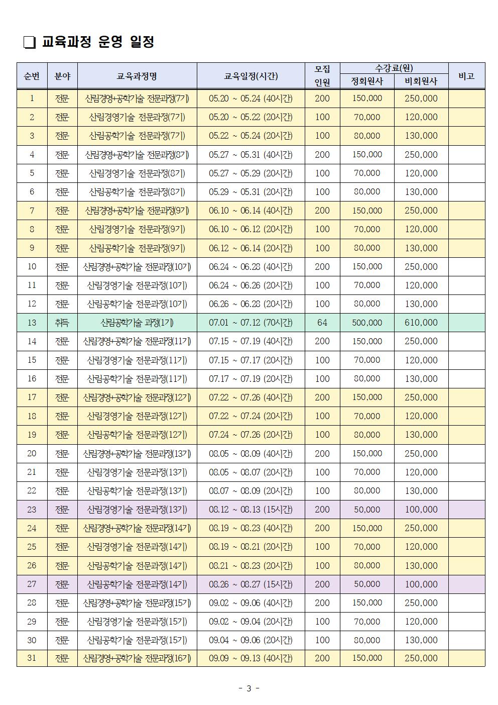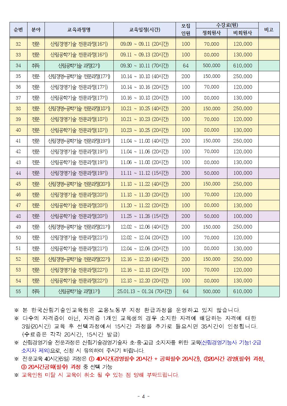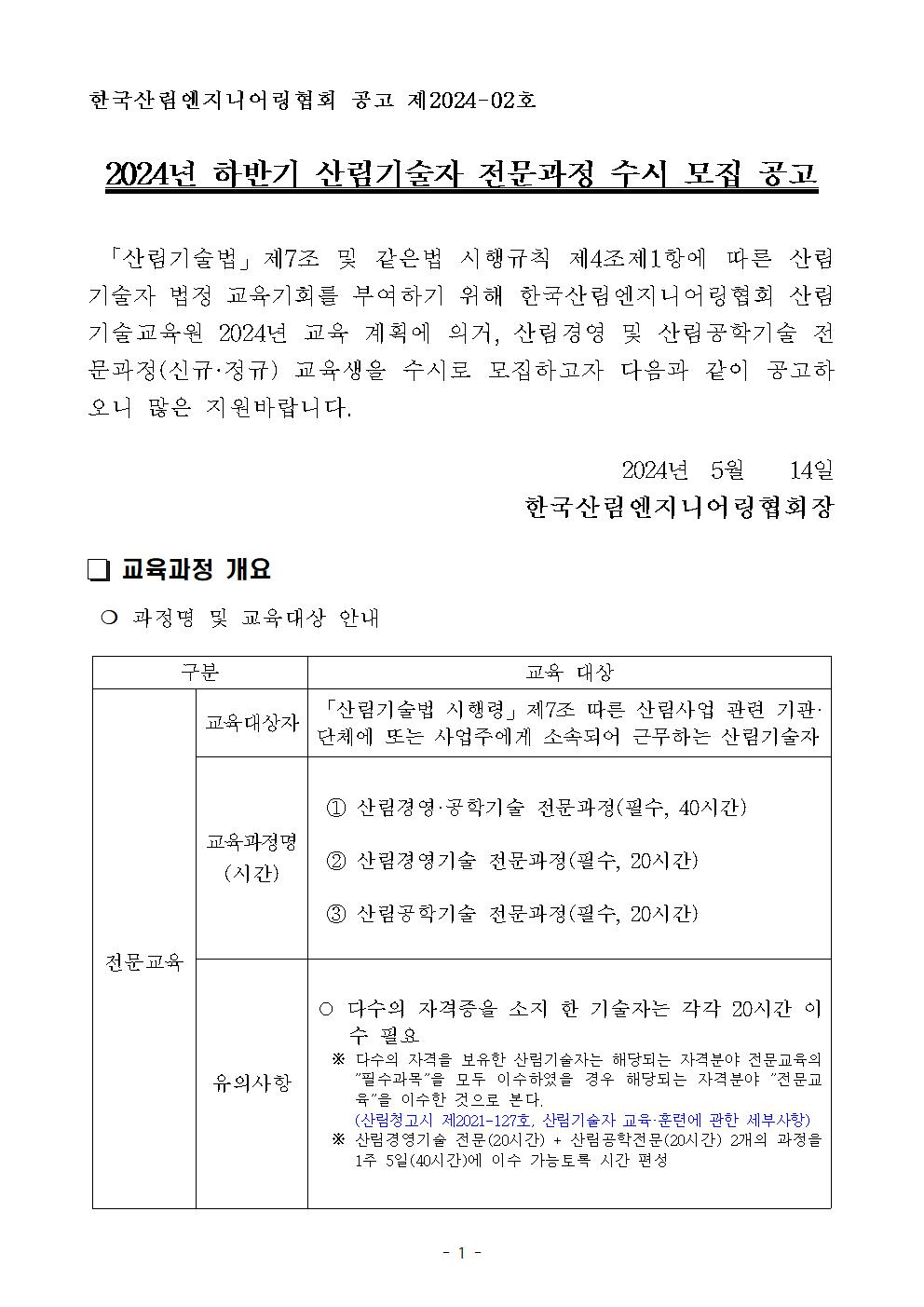 "2024년 하반기 산림기술자 전문과정 교육"을 아래와 같이 계획하여 교육생을 수시로 모집하고자 하오니 일정에 참고하시어 많은 지원바랍니다.