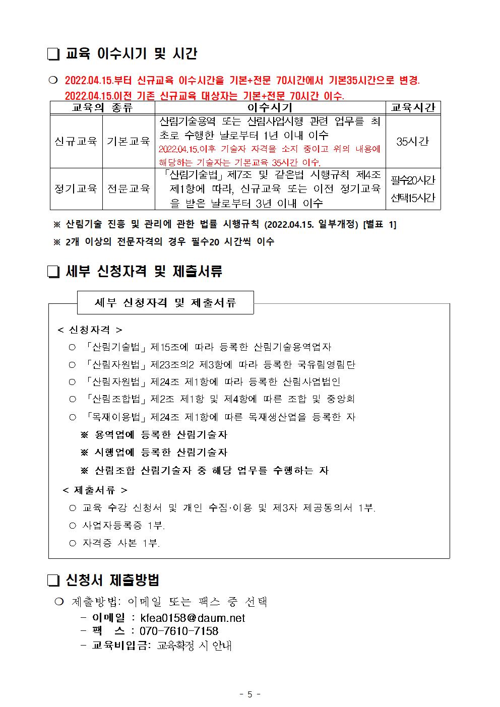 - 신 청 방 법 : 교육신청서 작성(*붙임 의 교육수강신청서 참조) 하여 교육 전 주 월요일까지 메일(kfea0158@hanmail.net)또는 팩스(070-7610-7158)로 전송
