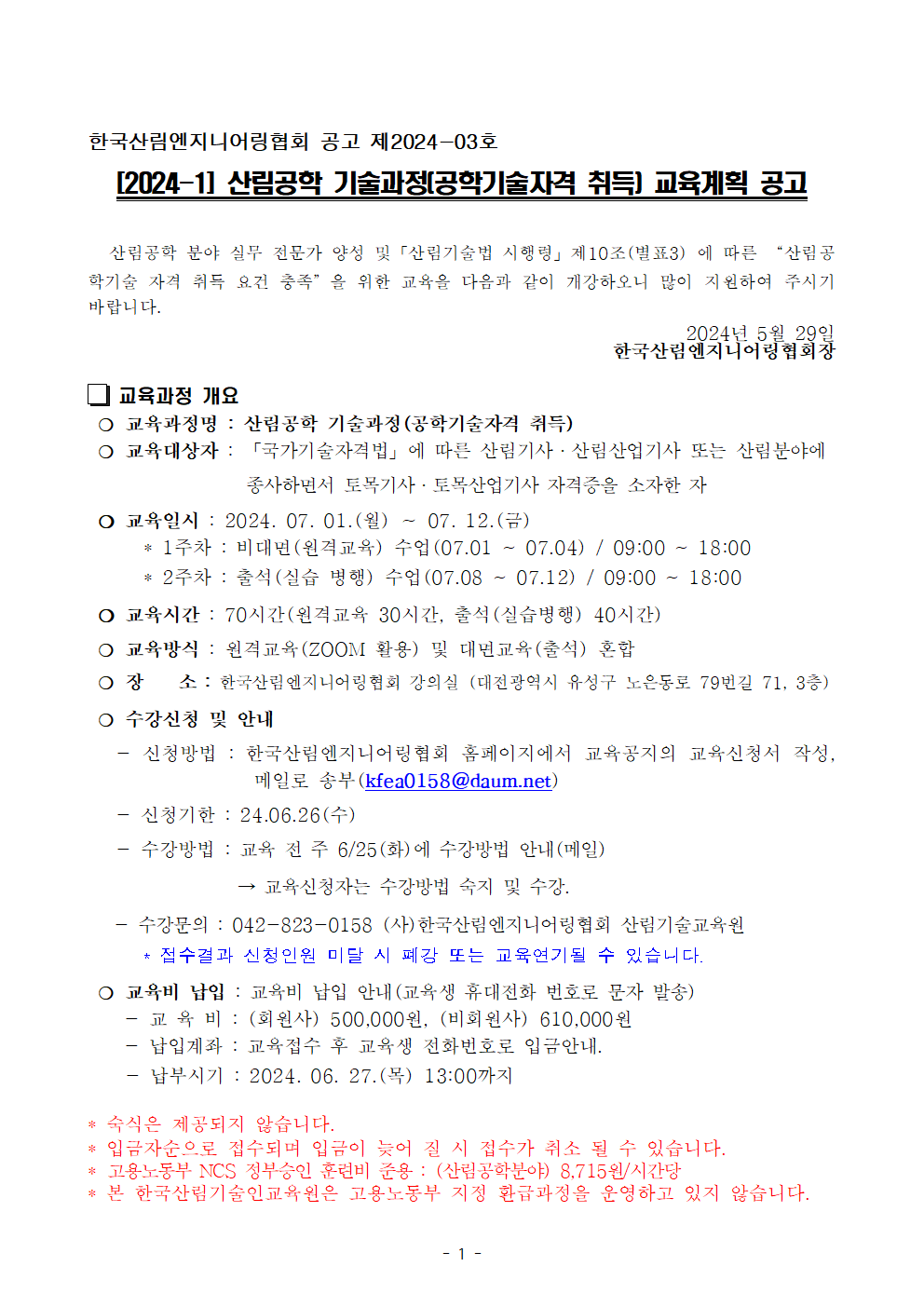"2024-1 산림공학 기술과정(공학기술자자격 취득과정)"교육을 아래와 같이 계획하오니 많은 지원바랍니다.