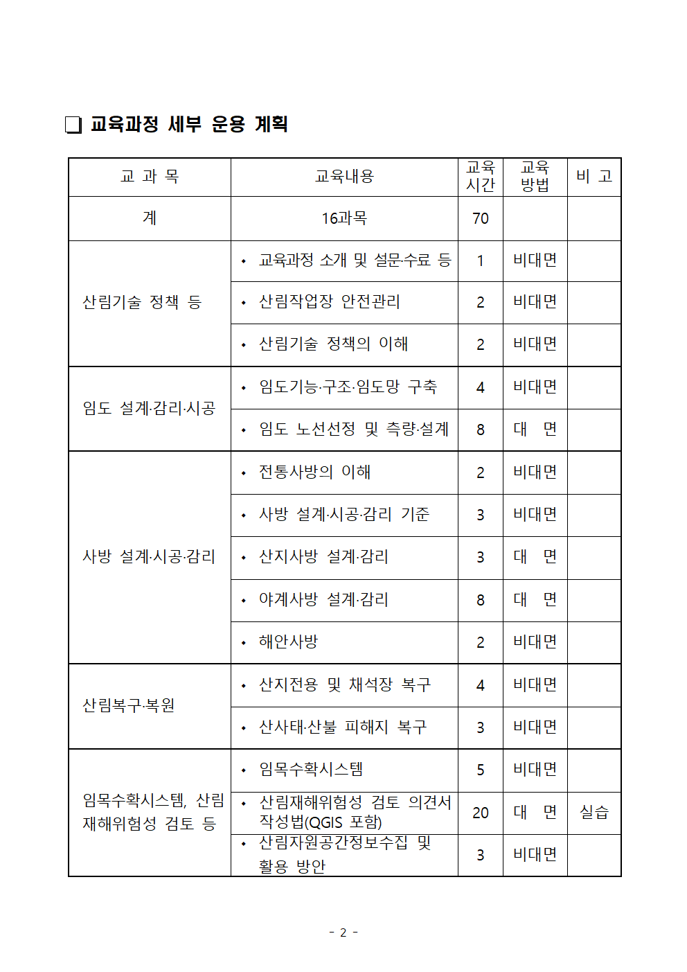 ♦ 교육 대상 : 「국가기술자격법」에 따른 산림기사·산림산업기사 또는 산림분야에 종사하면서 토목기사·토목산업기사 자격증을 소지한 자.