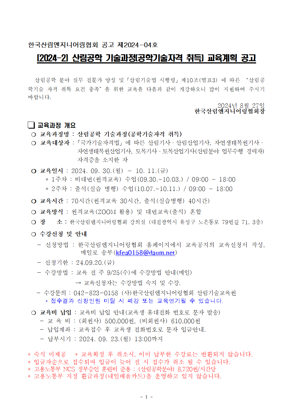 "2024-2 산림공학 기술과정(공학기술자자격 취득과정)"교육을 아래와 같이 계획하오니 많은 지원바랍니다.