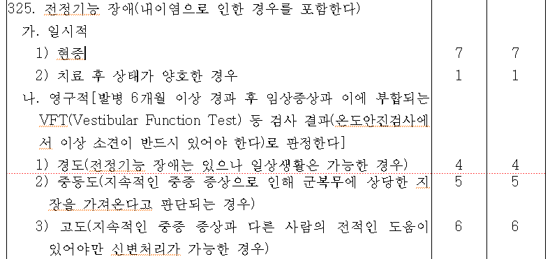 ■ 병역판정 신체급수 심사에서 종종 분쟁이 발생하는 곳 중 한 곳이 ‘전정기능장애, 국부령제1139 제325호’입니다. 병역판정 신체검사 등 검사규칙 질병·심신장애의 정도 및 평가기준에서 정하고 있는 규정은 아래와 같습니다.