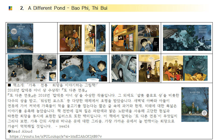 토요톡톡(231202)_ The Promise(Nicola Davies), A Different Pond(Bao Phi~) 작성자배곧해솔중 김미숙|작성시간24.01.17|조회수40 목록 댓글 0 글자크기 작게가 글자크기 크게가 The Promise by Nicola Davies231202_____.hwp17.03MB 첨부파일첨부된 파일이 2개 있습니다. png 파일 image.png 다운로드 hwp 파일 231202_____.hwp 다운로드 다음검색 현재 게시글 추가 기능 열기 북마크 공유하기 신고 센터로 신고 댓글 댓글 0 댓글쓰기 답글쓰기 댓글 리스트