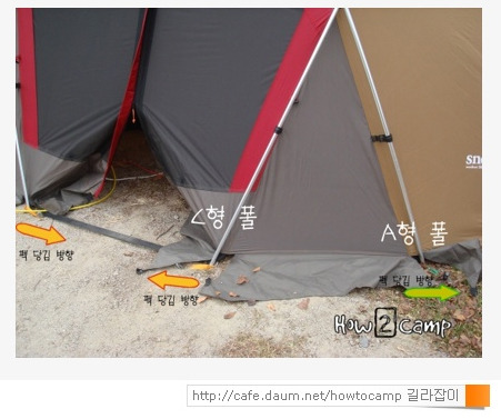 또한, 텐트 설치 시 지퍼를 보호하는 방식으로 펙을 박아야 합니다. 특히 리빙쉘 측면 문 같은 경우 구조상 좌우로 텐션을 많이 받게 되는데, 다시 말하자면 세로로 닫힌 지퍼를 양쪽으로 계속 잡아당기는 모양이라는 의미입니다. 팽팽한 상태로 계속 지퍼를 사용하게 되면 아무래도 고장이 날 확률이 커질 수밖에 없겠지요. 이에 측면 출입구의 하단 펙을 박을 때는 텐션의 반대 방향, 즉 지퍼쪽으로 웨빙 끈을 끌어당겨서 텐션을 줄여줘야 합니다. 여기에 해당하는 폴대는 측면 C형 두 개입니다.