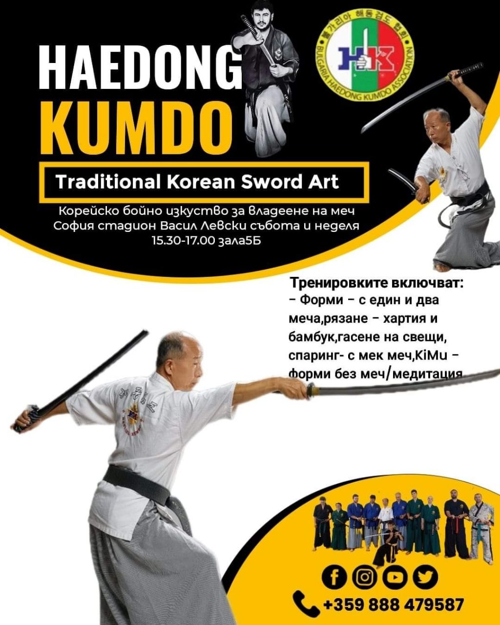Haedong Kumdo encompasses practices such as breathing (meditation), two swords techniques, and other weapon skills, physical exercises (health-focused and practical), as well as healing practices (bare hands, acupuncture, cupping, etc.).