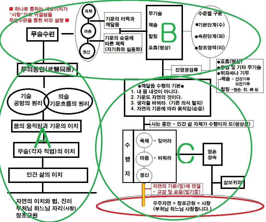 http://cafe.daum.net/uwhkf/JvX3/94 아래 영문 내용은 무술 수련생과 지도자들을 위한 것으로 설명되어졌으나 여기서는 한글로 좀 더 간략하게 그림과 함께 주요부분의 번역과 부언 설명을 해 보기로 합니다. ■A 표시영역은 모든 것은 하나의 이치에서 나온다는 것으로 자연의 이치 = 인간삶의 이치 = 일상사(각자 직업 등)의 이치 = 무술의 이치 = 몸(기운, 움직임)의 이치 = 술기와 의술의 이치로 구분해서 도표로 표시한 것이며, 각자 한 만큼 각자의 수준과 정도를 가지는 것으로 수, 파, 리를 인용해서 비교 설명해 보았슴. ■B 표시 영역은 몸기계를 빌어 이 세상에 나온 인간이 각자의 생활 속에서 그것을 어떻게 사용해야 하는 지 기본 이치를 설명한 것임. 즉 인간 몸 = 영(E) + 혼(E) + 육체(E) 다양한 생각을 통한(혼의 작동) 다양한 모습을(육체) 통해 깨달아가면서 인간삶(수행)의 터득 엎어지고 깨어지고 반복되는 경험을 통해서 만들어진다. - 주변 기운의 터득 - 추세부응 - 깨달음 반복되는 잘못과 실수를 통한 깨달음으로 스스로 올바른 길로 가려고 최선을 다하는 마음이 영, 즉 본래마음자리(공)를 닮아간다. - 불성화(성령화) - 자기화와 실용화 - 잘 사는 길 (인간 유사 이래 모든 종교, 철학, 인문 등에서 인간에게 가르치는 목표) ■C 표시 영역은 사는 동안 어떻게 실천해야 하며, 왜 그렇게 해야 하는 지를 알도록 하였으며, 그리고 인간 삶의 궁극적 목표를 알아차리고 지금 내가 생각하고 말하고 행동하는 것이 과연 올바른 것인지, 필요한 것인지, 계속 해도 되는 것인지, 자신 스스로를 돌아보고 올바른 판단을 통해 불필요한 것들을 과감히 떨칠 수 있도록 이해를 돕고자 아래 그림으로 간단히 표시하였습니다. 인간은 순간 속에 살아가는 자연 속 지극히 작은 하나의 개체일 뿐입니다. 올바르게 이치와 목적을 터득하지 못하면 한 평생 착각과 허상 속에서 무지와 욕심으로 빚어내는 수많은 것들을 스스로 만들어 내면서, 스스로 거기에 빠져 뒹굽니다. 하지 않아도 될 일에, 필요하지도 않는 일들에 많은 시간과 공을 들이면서 아주 심오하게 고차원적으로 다가섭니다. 아무리 복을 달라고 빌어도, 아무도 주지 않습니다. 아무리 믿는다고 해도, 누가 믿어라고 하지 않습니다. 신께서는 인간에게 빌어라, 믿어라, 따르라, 찬양해라 등의 말씀을 하지지 않습니다. 하셔야 될 띠끌만큼의 이유도 없습니다. 이렇게 돌아가나, 저렇게 돌아가나, 죽은 자나 산 자나 모두 다 부처님 하느님의 것이기 때문입니다. 우주자연, 부처님, 하느님, 신은 있는 그대로 계십니다. 신께서 보시는 인간이나 나무나 새나 동물들의 영혼은 그 무게가 똑같습니다. 인간의 욕심과 무지가 두렵게 만들고, 힘들게 만들며, 편을 만들어 시시비비가 생겨납니다. 미래에 무슨 일이 닥쳐오던, 과거에 무슨 일이 있었던 있어야 할 일이 있었던 것이며, 일어나야 될 일이 일어나는 것입니다. 괜히, 행여나, 혹시나 하는 군중심리로 부하뇌동하는 것은 모두다 나의 무지와 욕심에서 나옵니다. 모든 것은 다 내가 만들고, 내가 저질러놓고, 내가 거기 머뭅니다. 모두 다 내 탓입니다. 지금 이 순간 최선을 다하는 것 말고는 정답이 아닙니다. - 중도 진실하고 바른 깨달음이란 가장 우선적으로 자신의 사랑과 가족과의 사랑이 먼저임을 절실하게 알아차리며 주변의 사랑으로 전해지게 됩니다. 가족을 등진 깨달음은 이 세상에 있을 수 없으며, 끼니를 억지로 거르면서 하는 깨달음도 무지몽매한 일이며, 수행이란 명목으로 일하지 않고 밥만 축내는 것은 잘 사는 길의 역행이며 가난해야 한다는 것으로 마지막으로 숟가락 밥그릇만 남기는 것도 참 알 수없는 노릇입니다. 만일 그러한 사람들이 존경받고 추앙받는다면, 그것은 선진국민의식 속에서는 있을 수 없는 일이 됩니다. "생각을 바꿔라, 그래야 내가 산다." 라는 말이 바로 그것입니다. 본 내용과 아래 그림들은 수행의 바른 길 제5편 제목 : "각자 스스로의 길을 찾아서" 에서 일부 발췌하여 인용된 것입니다. 수행의 바른길 3편 미리보기 아래 사이트 http://mbook.interpark.com/shop/product/detail?prdNo=278787154 ◆Further Information in English and Korean=> http://cafe.daum.net/uwhkf/JvX3/90 How about trying to ask by yourself why we should learn & teach these kind of stuffs into the training of Martial arts, and in life as well? See a diagram, and think out of the box! I am going to make descriptions in brief with the division of 3 area for better understanding with ease through the below diagram which shows all is interconnected in the universe under one principle.