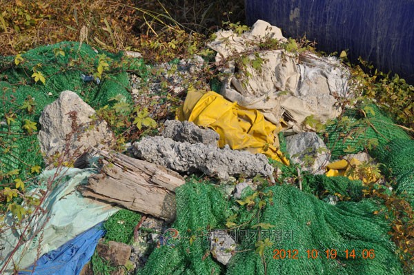 이밖에 도로에 포설했던 부직포를 버려진 채 방치돼 있거나 세륜시설 주변에는 별도 분리해 보관해야 할 건설폐재류인 폐콘크리트를 폐목재와 가연성폐기물에 혼합한 채 풀숲에 보관, 거의 방치 수준에 가깝다.