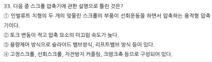 답댓글 작성자지식도매상 작성시간 22.06.24 3번 보기는 스크롤 압축기가 아닌 스크류 압축기에 용량제어 방식에 대한 설명입니다. 스크롤 압축기에 용량제어 방식에는인버터에 의한 회전수제어, 흡입 토출구의 개도 조절을 통한 제어 (간극조절+전자식 팽창밸브) 등이 있습니다.