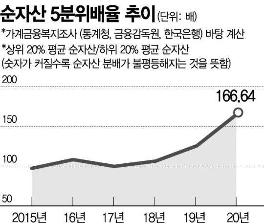 지난해 3월 말 기준 '순자산 5분위 배율'은 166.64배로, 직전 해(125.60배) 대비 41.04배 포인트 오른 것으로 나타났다. '순자산 5분위 배율'이란 보유한 순자산 상위 20% 그룹(5분위) 가구의 평균 순자산을 하위 20% 그룹의(1분위) 순자산으로 나눈 값이다. 수치가 높을수록 상·하위 그룹 간 순자산 격차가 벌어지고 있다는 뜻이다.