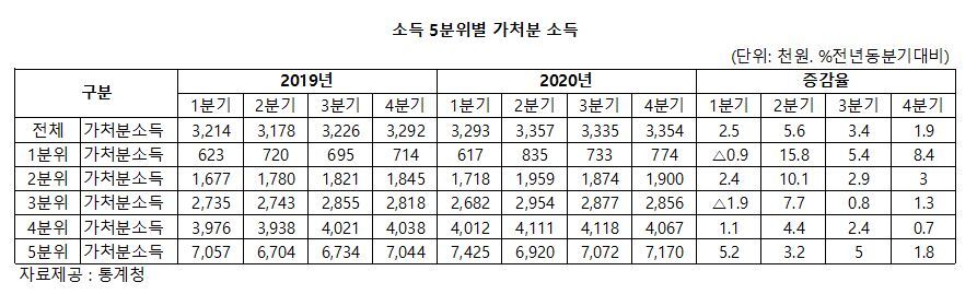 통계청 자료에 따르면, 상위 20%의 소득과 하위 20%의 소득격차를 나타내는 '소득 5분위 배율'의 경우 지난 2019년 4·4분기 11배였던 반면, 코로나가 발생한 2020년 1·4분기에는 15배, 4분기에는 12배 가량 증가하였고, 올해 1·4분기는 16배로 최근 3년간 가장 극심한 차이를 보였다.