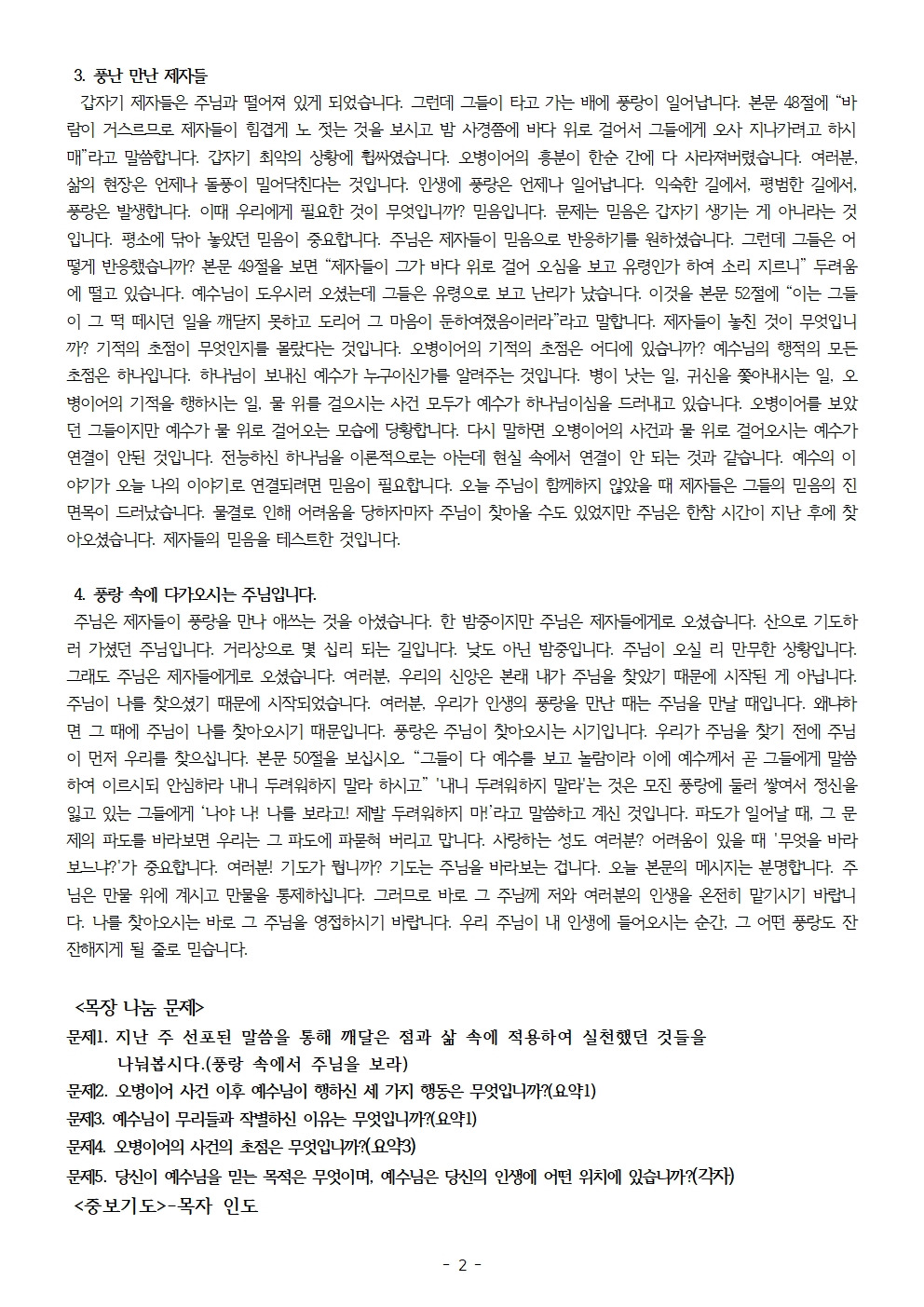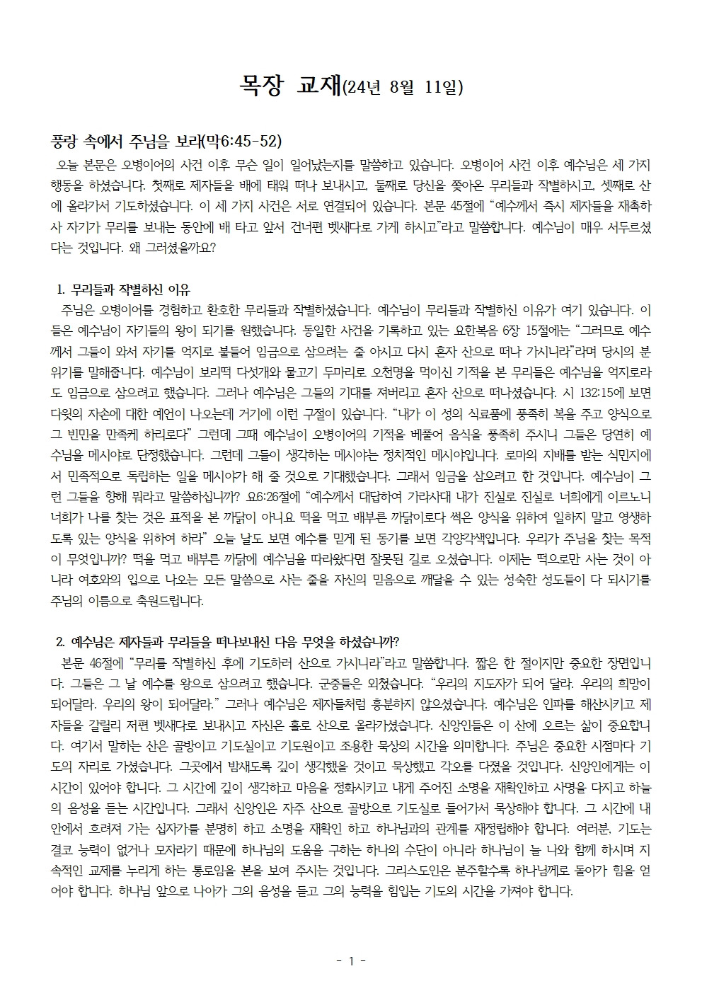 24-31주 / 8월 11일 / 풍랑속에서 주님을 보라 작성자함순석|작성시간24.08.11|조회수18 목록 댓글 0 글자크기 작게가 글자크기 크게가 2024년-8월-3주.hwp108.50KB 첨부파일첨부된 파일이 3개 있습니다. jpg 파일 목장 교재(24년8월11일,풍랑속에서 주님 을 보라(막6장45-52)001.jpg 다운로드 jpg 파일 목장 교재(24년8월11일,풍랑속에서 주님 을 보라(막6장45-52)002.jpg 다운로드 hwp 파일 2024년-8월-3주.hwp 다운로드 다음검색 현재 게시글 추가 기능 열기 북마크 공유하기 신고 센터로 신고 댓글 댓글 0 댓글쓰기 답글쓰기 댓글 리스트