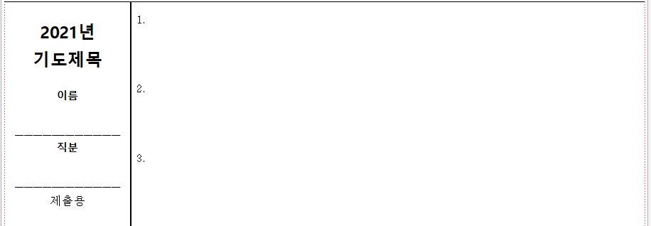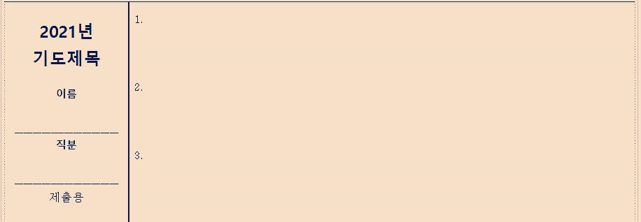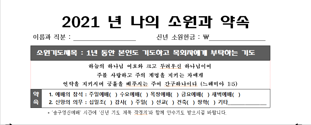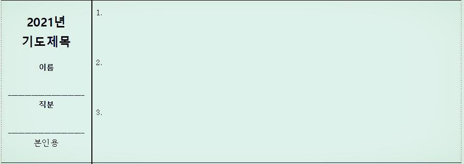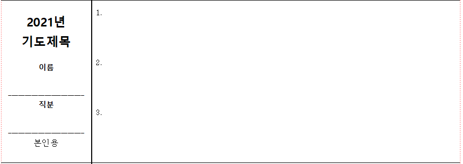 2021 신년소원헌금 봉투와 기도제목 카드(제출용, 본인용) 작성자장민정간사|작성시간20.12.20|조회수423 목록 댓글 0 글자크기 작게가 글자크기 크게가 신년소원기도카드(본인용).PNG5.39KB신년소원기도카드(제출용).PNG5.35KB 신년소원헌금봉투.PNG25.11KB 첨부파일첨부된 파일이 6개 있습니다. etc 파일 신년소원헌금봉투.PNG 다운로드 etc 파일 사본-신년소원기도카드(제출용).PNG 다운로드 etc 파일 사본-신년소원기도카드(본인용).PNG 다운로드 etc 파일 신년소원기도카드(본인용).PNG 다운로드 etc 파일 신년소원기도카드(제출용).PNG 다운로드 etc 파일 신년소원헌금봉투.PNG 다운로드 다음검색 현재 게시글 추가 기능 열기 북마크 공유하기 신고 센터로 신고 댓글 댓글 0 댓글쓰기 답글쓰기 댓글 리스트